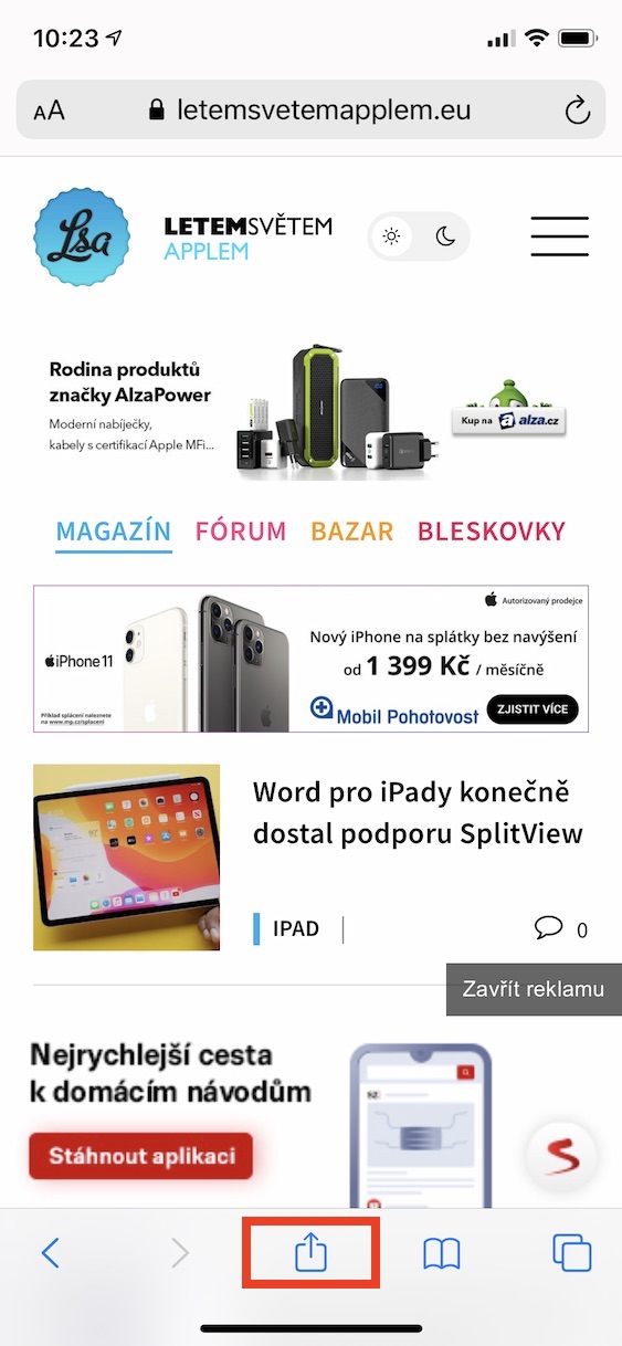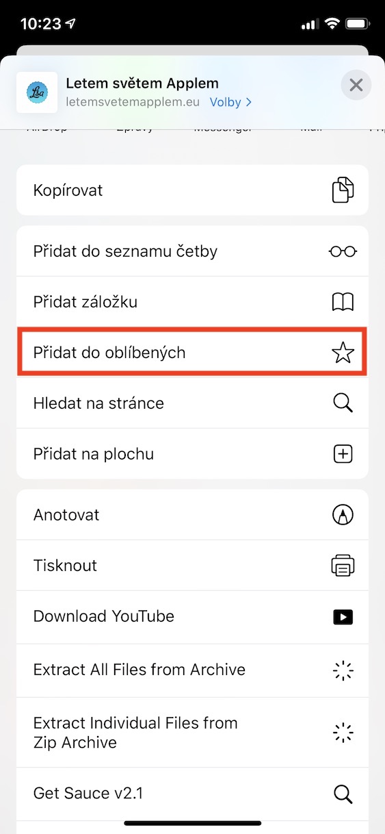 Pokud si chcete LsA přidat do záložek na iPhonu či iPadu, tak se přesuňte do Safari a otevřete webovou stránku https://www.letemsvetemapplem.eu/. Poté stačí ve spodní části obrazovky klepnout na ikonu sdílení (čtvereček se šipkou), kde z menu vyberte možnost Přidat do oblíbených. Tímto se magazín LsA bude objevovat na úvodní stránce Safari ve vašem iPhonu či iPadu.