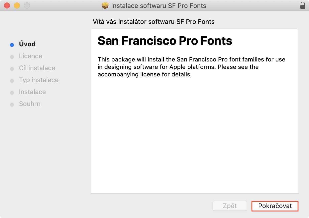 Apple svůj vlastní font nabízí zdarma ke stažení. Pokud si jej chcete stáhnout, tak se na vašem Macu přesuňte na stránku Fonts od Apple – stačí, abyste klepnuli na tento odkaz. Jakmile tak učiníte, tak na stránce sjeďte níže a stáhnetě si buď font SF Pro (využití v iOS, iPadOS či macOS) anebo SF Compact (využití ve watchOS). K dispozici jsou ještě styly SF Mono a New York. U vybraného fontu klepněte na tlačítko pro stažení. Jakmile se soubor s příponou DMG stáhne, tak na něj dvakrát klepněte. V novém okně poté klepněte na ikonu boxu a proveďte klasickou instalaci, ve které se proklikejte, společně s potvrzením podmínek, až na konec. Jakmile instalaci dokončíte, tak můžete začít písmo San Francisco používat naplno.