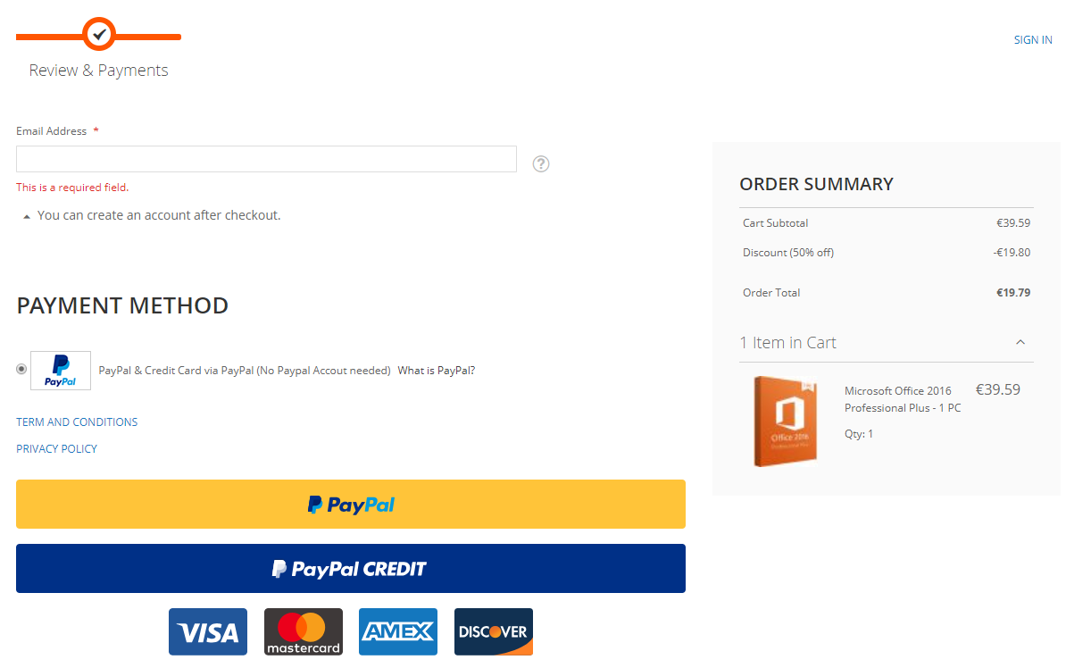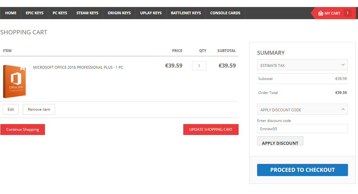 V níže přiložené galerii se podíváme na samotný nákup. Pro názornou ukázku si vezmeme Microsoft Office 2016 Professional, který vložíme do košíku pomocí tlačítka ADD TO CART. Tímto krokem se nám otevře nové okno, kde klepneme na View Cart, čímž přejdeme přímo do košíku. Zde nesmíme zapomenout na to nejdůležitější, čímž je samozřejmě slevový kód. Do pole Enter discount code zadáme KWS50, kód potvrdíme tlačítkem APPLY DISCOUNT a vzápětí se nám odečte zmiňovaných 50 procent. Nyní už jen stačí naši objednávku potvrdit. Toho dosáhneme kliknutím na PROCEED TO CHECKOUT, kde vybereme platební metodu, zaplatíme a máme hotovo.