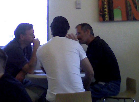Přestože by se společnosti Google a Apple daly v mnoha směrech považovat za konkurenty, měl Steve Jobs v minulosti poměrně blízký vztah ke spoluzakladatelům Googlu – Larrymu Pageovi a Sergeyi Brinovi. Důkazem tohoto přátelství jsou mimo jiné také snímky, které se tento týden objevily online. Na vzácných fotografiích jsou zachyceni Jobs, Page a tehdejší šéf Googlu Eric Schmidt v prostorách Googleplexu. Snímek byl pořízen v době, kdy byl do prodeje uveden první iPhone. Když ho společnost Apple počátkem roku 2007 představovala, nechyběl na pódiu ani Eric Schmidt, který zde promluvil o Google Maps a YouTube.