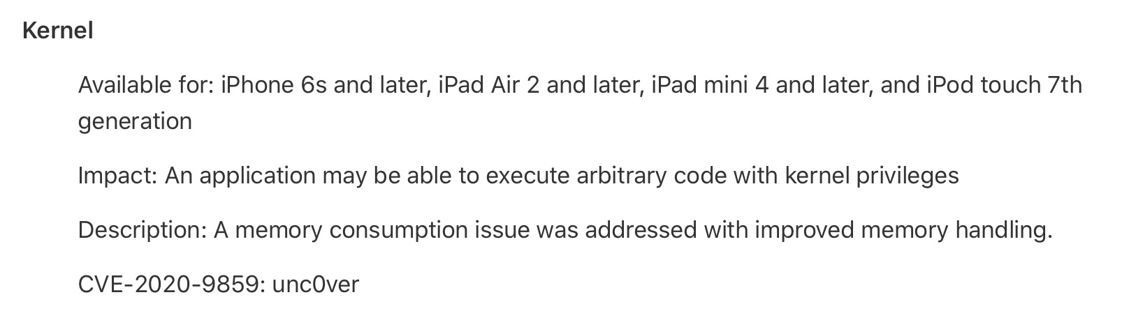 Jak jsme zmínili v odstavci výše, tak Apple v minoritních aktualizacích svých operačních systémů většinou opravuje různé chyby a bugy. V novém iOS a iPadOS 13.5.1 však došlo k opravě takových chyb, díky kterým bylo na zařízení možno nainstalovat jailbreak. O tuto informaci se podělil sám Apple, a to v příspěvku na své stránce věnované bezpečnosti. Podle popisu na této stránce dochází k opravě chyby, díky které mohly být aplikace schopné spustit libovolný kód s právy v jádru. Níže ve zprávě poté přímo naleznete označení chyby a zmínku unc0ver. Chyby jádra, které využívá právě unc0ver, může Apple opravit prostřednictvím aktualizací, narozdíl od chyb hardwaru, které využívá jailbreak checkra1n.