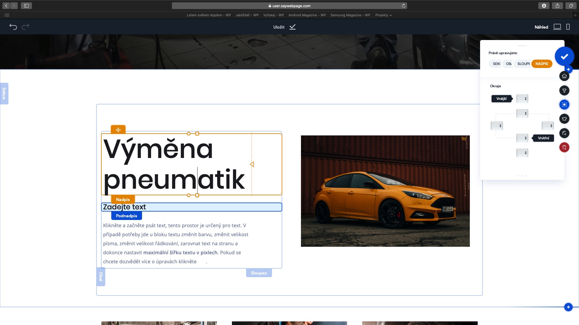 Title a subtitle, česky chcete-li nadpis a podnadpis, jsou velmi důležité prvky pro stavbu vaší webové stránky. Nadpisy i podnadpisy je velmi důležité využívat také kvůli SEO. To, co je opravdu důležité, je nutné označit nadpisem, a to, co je méně důležité, zase podnadpisem. Nadpisy i podnadpisy lze upravovat stejně, jako všechny jiné elementy na vašem webu. Pokud chcete (pod)nadpis upravit, tak na něj klepněte. Poté se vám napravo zobrazí menu, ve kterém můžete změnit maximální šířku, barvu a mnoho dalších aspektů. V případě mobilní verze se nadpisy a podnadpisy nedají editovat – systém v tomto případě přebere kontrolu. Na druhou stranu se však ale nadpis vždy zobrazí větším písmem, než podnadpis.