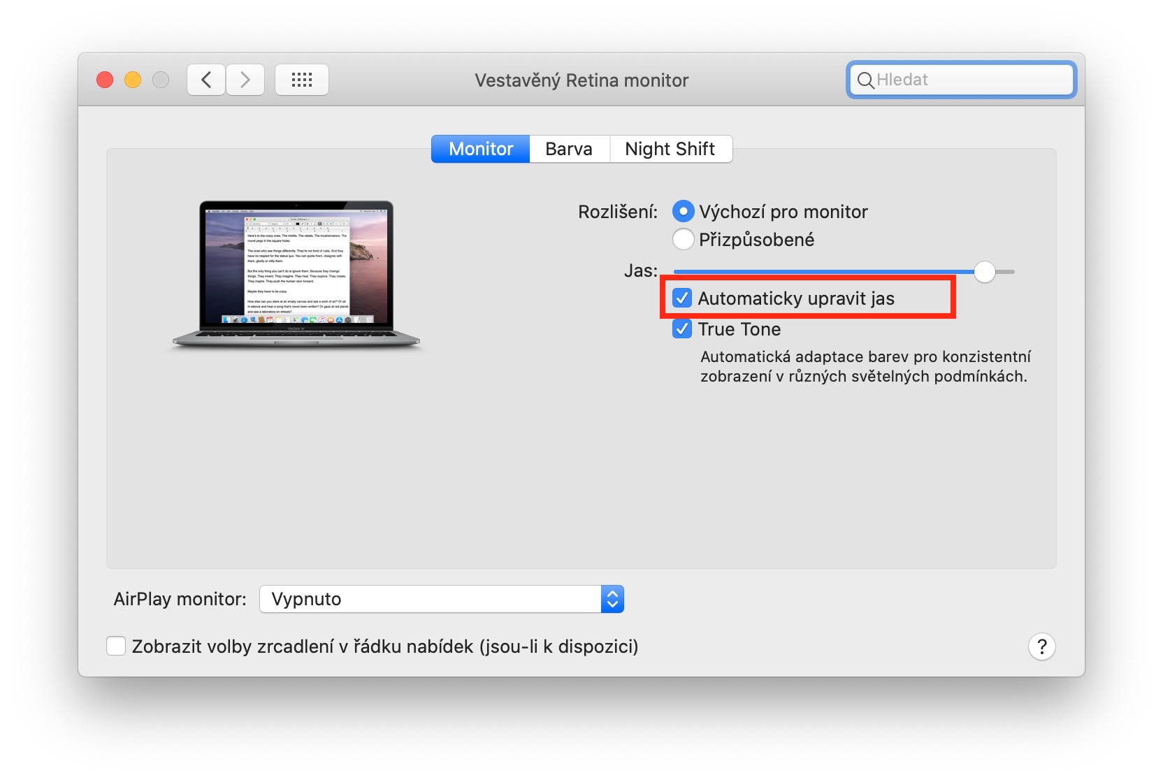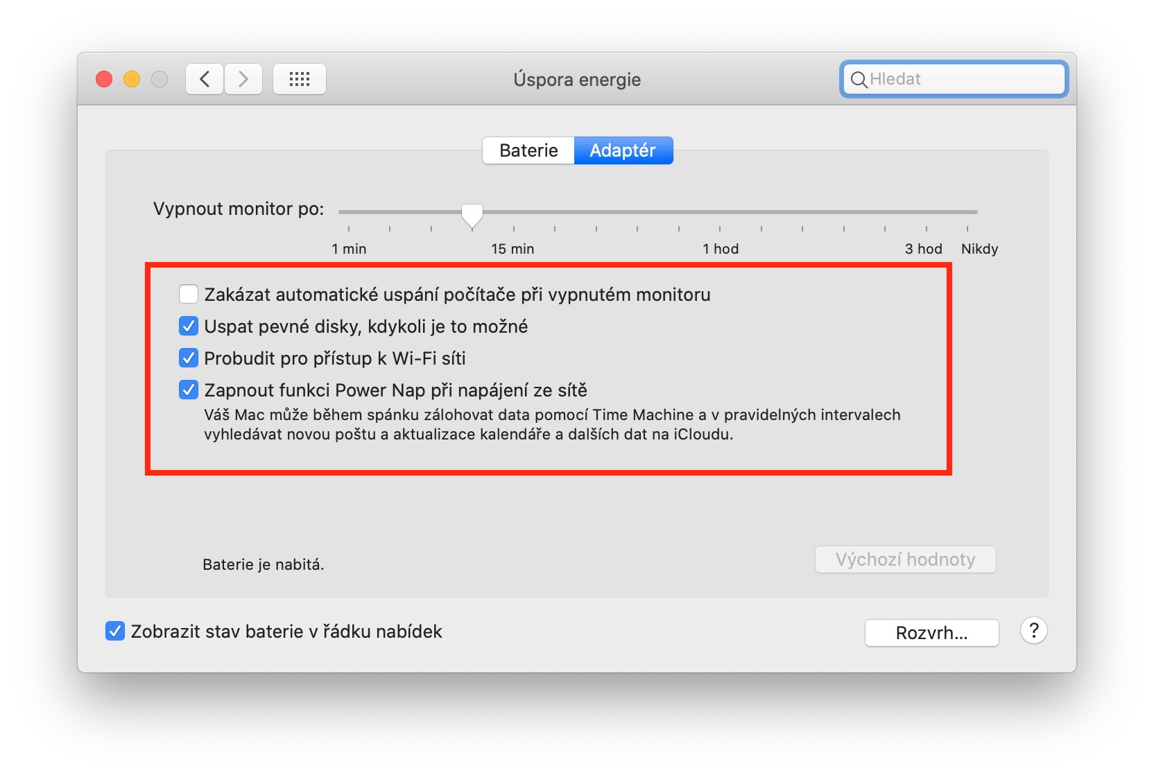 Jas displeje zapnutý na maximum má také výrazný vliv na spotřebu baterie vašeho Macu. V případě, že chcete výdrž své baterie prodloužit, byste měli snížit jas displeje. Pokud na svém Macu nastavíte automatické přizpůsobení jasu, nemusíte se o nic starat – macOS vše potřebné zvládne za vás. Automatické přizpůsobení jasu displeje aktivujete po kliknutí na menu v levém horním rohu obrazovky -> Předvolby systému -> Monitory, kde zaškrtnete možnost Automaticky upravit jas. Dalším nastavením, které můžete v Předvolbách systému provést, je aktivace úspory spotřeby. Ve spodní části okna Předvoleb systému klikněte na Úspora energie a nastavte časovač uspání a další podrobnosti.