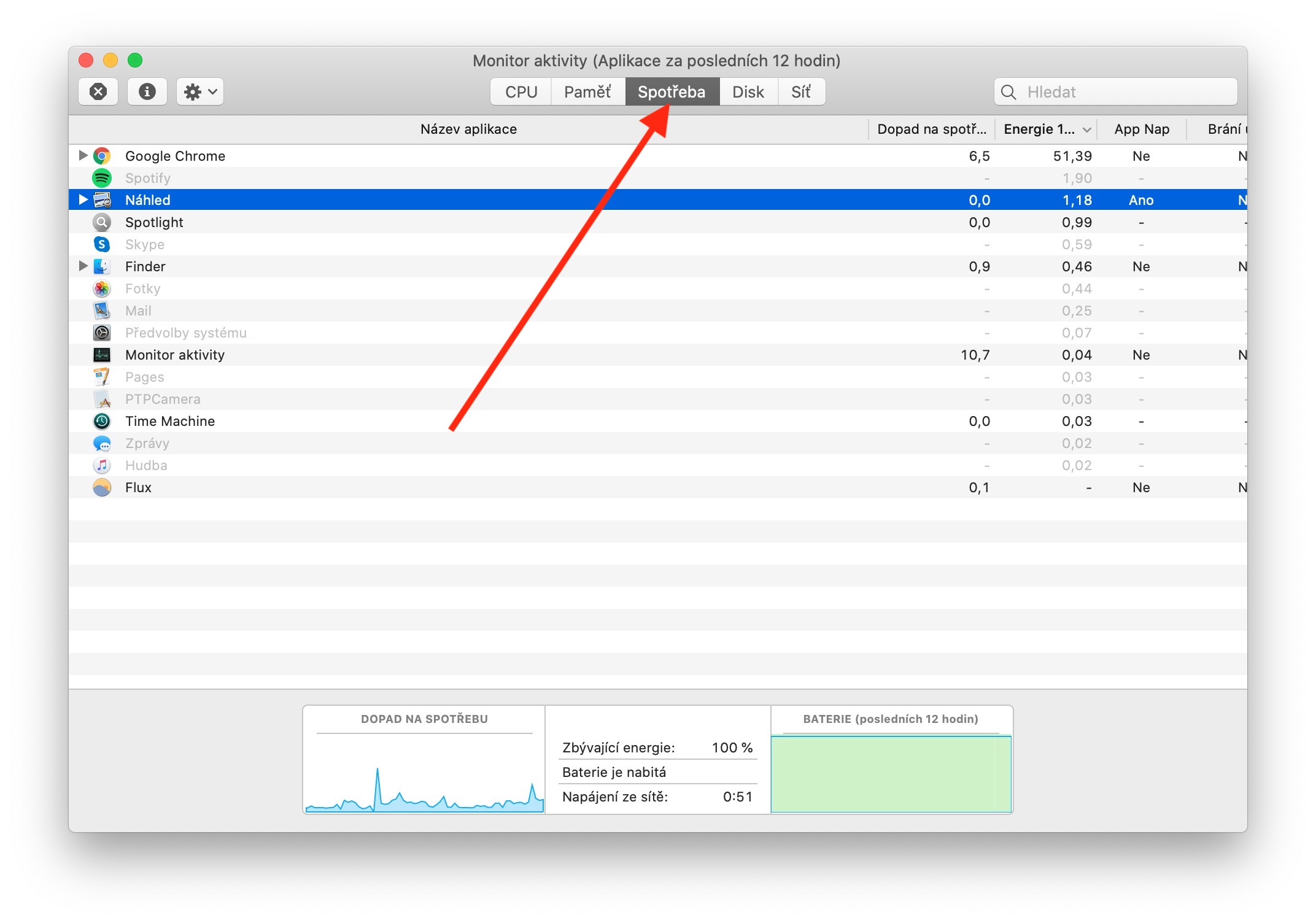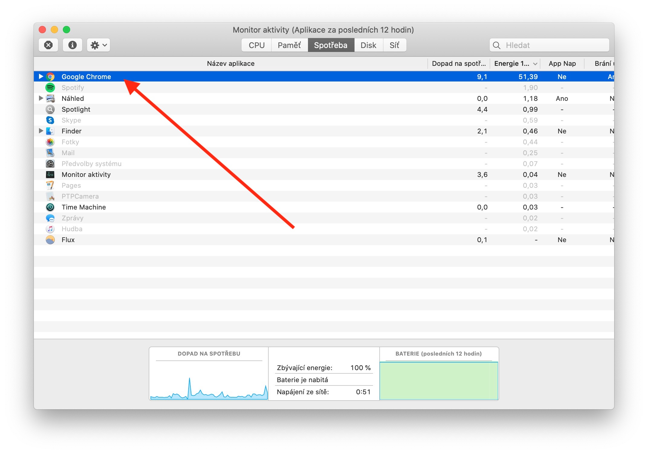 MacBooky mnohdy zvládnou běh spousty běžných aplikací na pozadí, aniž by se to výrazněji podepsalo na jejich momentálním výkonu. Provoz aplikací ale pochopitelně také ovlivňuje spotřebu baterie vašeho jablečného laptopu, proto je v zájmu úspory její výdrže dobrý nápad nepotřebné aplikace ukončit. Na ikonku běžící aplikace na Docku ve spodní části obrazovky vašeho MacBooku klikněte pravým tlačítkem myši a poté zvolte Ukončit. Užitečnou pomůckou pro zjištění zátěže baterie je utilita s názvem Monitor aktivity, která vám poskytne informace o tom, jaké procesy mají na spotřebu baterie největší vliv. Nejrychlejší cestou ke spuštění Monitoru aktivity je aktivace Spotlightu stiskem kláves Cmd + mezerník. Do pole Spotlightu zadejte Monitor aktivity a v kartě utility klikněte v horní části na položku Spotřeba. Podívejte se, které procesy nejvíce zatěžují spotřebu vaší baterie a ukončete ty, které v danou chvíli nemusíte používat – dobrým nápadem je například vyměnit prohlížeč Chrome za Safari.