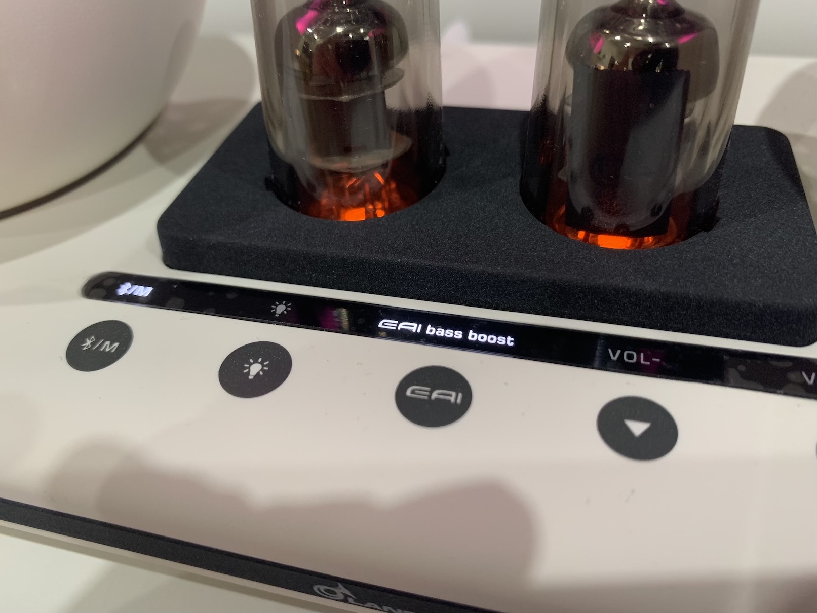 Kromě zmíněných elektronkových zesilovačů najdete uprostřed celkově pět různých tlačítek. První z nich slouží k tomu, aby se reproduktor přesunul do „párovacího“ módu – po stisknutí se tedy reproduktor stane viditelným pro ostatní zařízení v okolí, které se k němu mohou připojit. Druhé tlačítko slouží k ovládání osvětlení, na které se podíváme v odstavci níže. Prostřední tlačítko slouží k aktivaci Bass Boostu, tedy k módu pro zvýraznění basů. Poslední dvě tlačítka slouží k ovládání přehrávání hudby – skladby můžete pomocí nich přeskakovat, anebo se vrátit o jednu zpět. Jak už to u podobných reproduktorů bývá zvykem, tak lze pomocí těchto tlačítek také ovládat hlasitost – stačí je podržet. Na pravém reproduktoru se poté nachází značka pro NFC – právě zde je místo, ke kterému musíte přiložit zařízení s NFC pro rychlé spárování. Na zadní straně se poté nachází AUX konektor, tlačítko pro zapnutí/vypnutí reproduktoru a napájecí zdířka 16V / 2.5A.