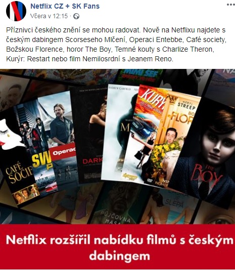 Je spousta lidí, kteří vyznávají český dabing před originálním zněním. Ačkoli titulů s českým dabingem na Netflixu moc není, situace se obrací k lepšímu. Český dabing nově přibude k filmům Mlčení, Operace Entebbe, Božská Florence, Café Society, The Boy, Temné kouty, Kurýr: Restart a Nemilosrdní.