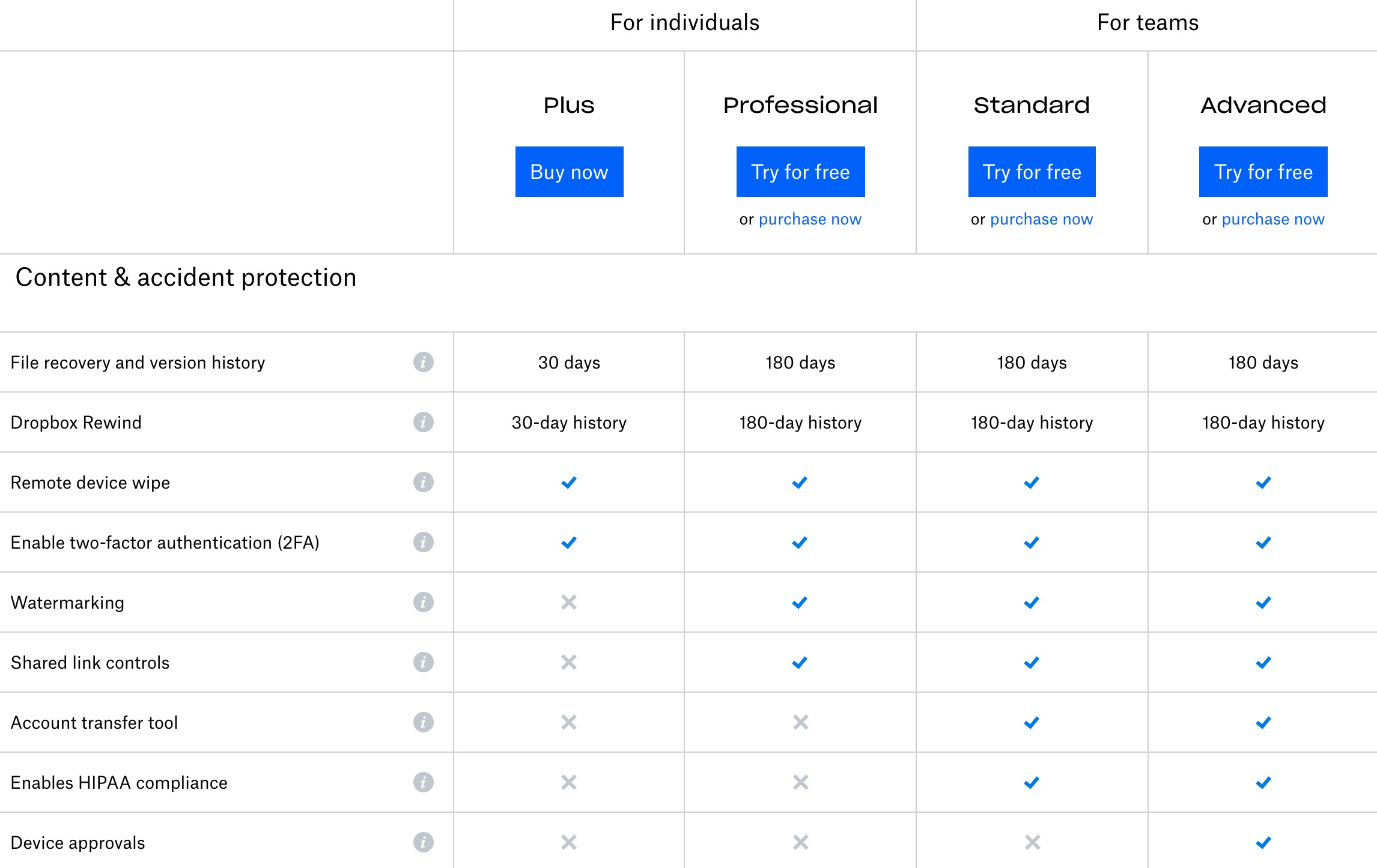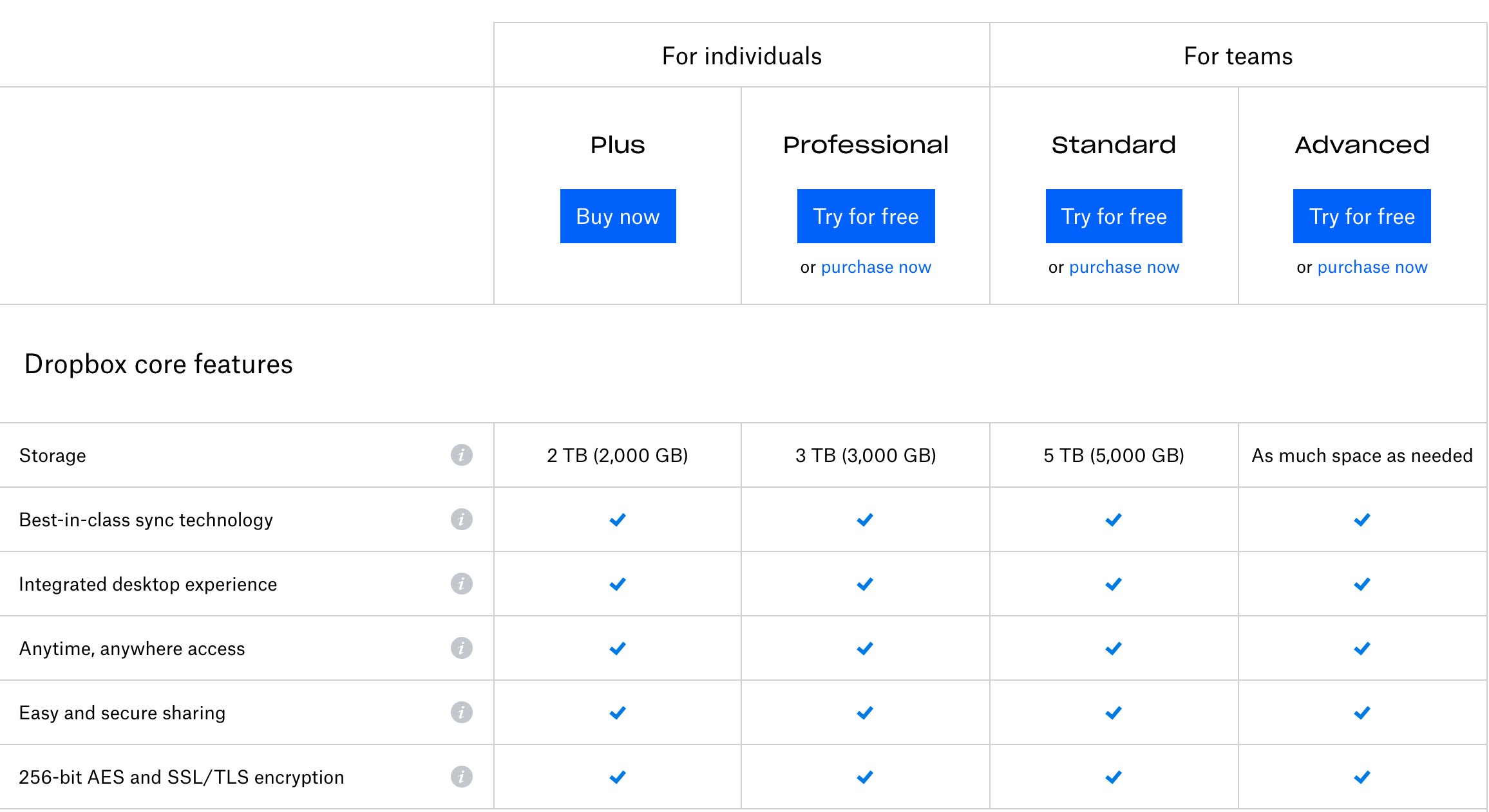 Mezi další populární řešení pro ukládání a sdílení obsahu online patří DropBox. V rámci bezplatné varianty nabízí Dropbox 2GB úložiště s možností přenosu 20GB za den. Dále Dropbox nabízí jednotlivcům 2TB úložiště za 9,99 eur měsíčně (zhruba 270 korun) nebo 3TB za 16,58 eur měsíčně (zhruba 450 korun). Pro týmy je pak k dispozici 5TB varianta za 10 eur měsíčně (zhruba 270 korun) a neomezená varianta za 15 eur měsíčně (zhruba 408 korun). Všechny placené varianty služby DropBox můžete zdarma vyzkoušet po dobu třiceti dní.