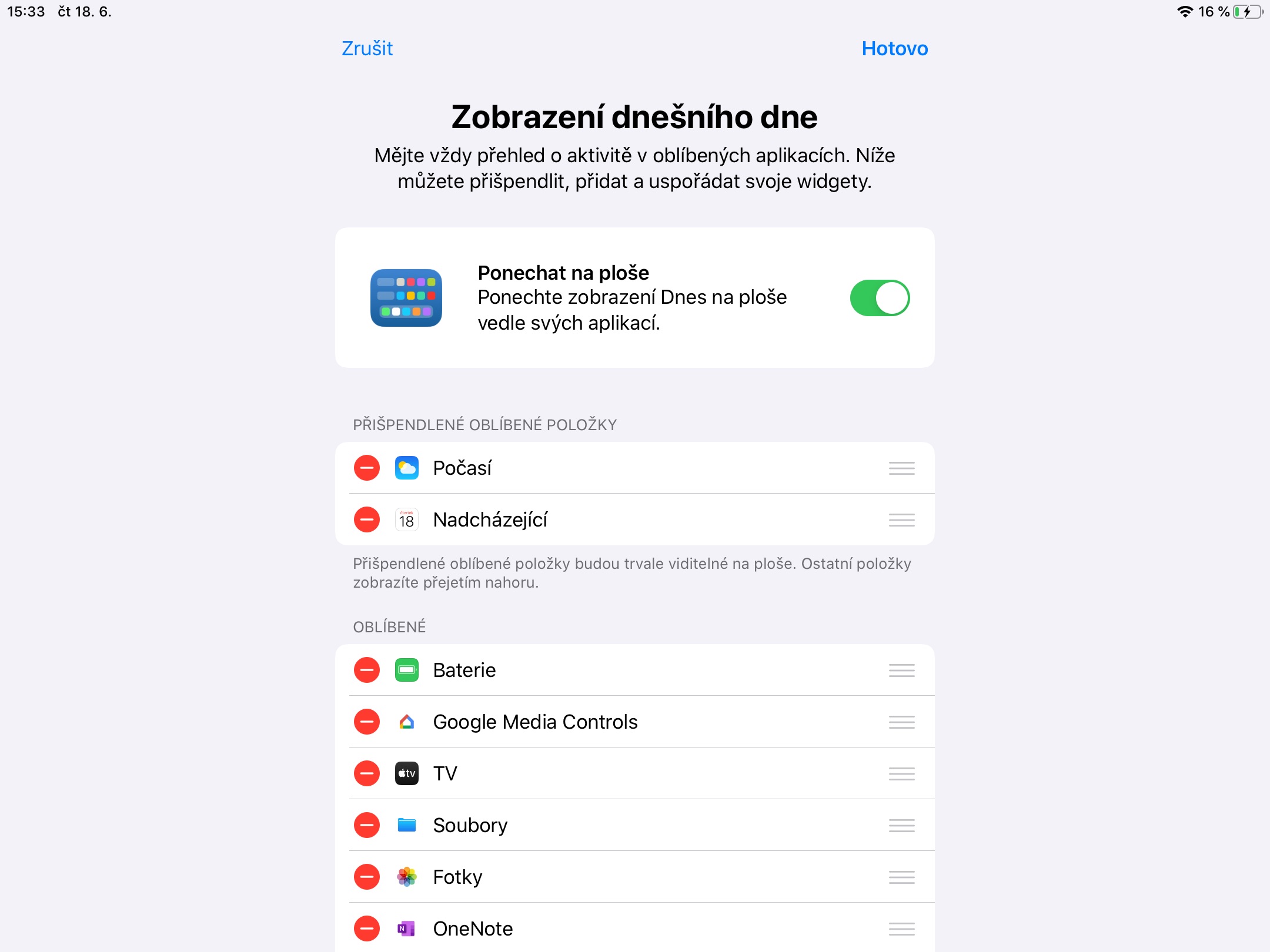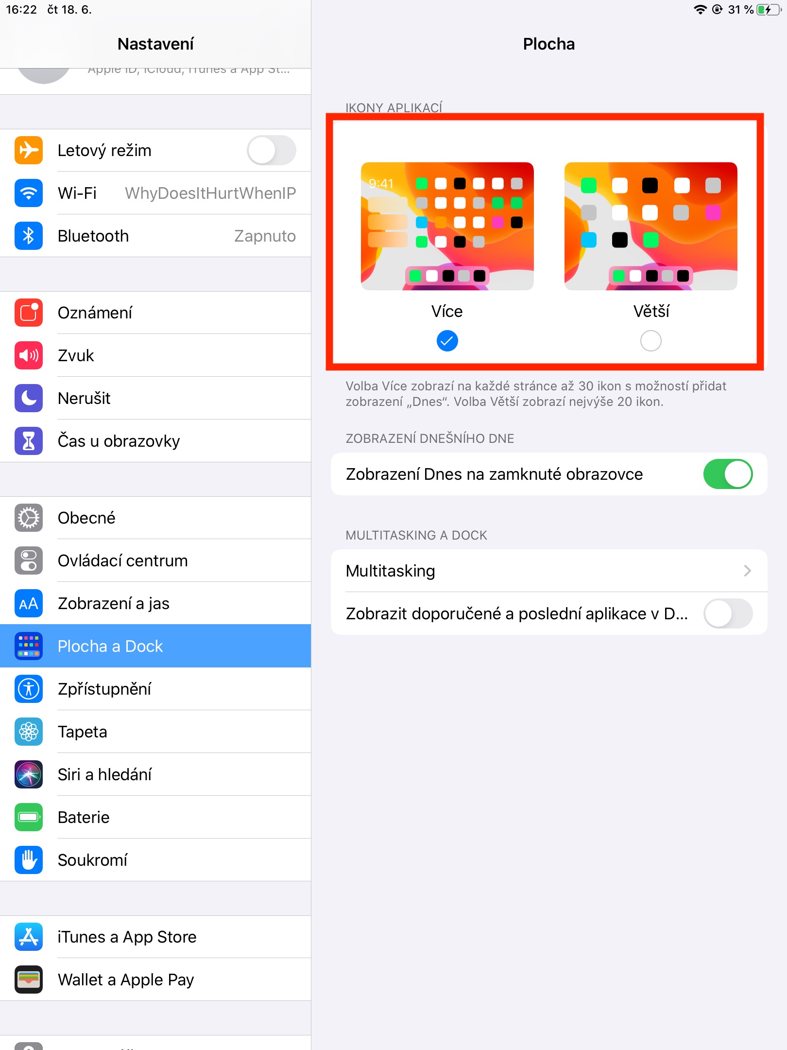 Plocha získala v operačním systému iPadOS zcela nové rozměry. V Nastavení ->Plocha a Dock můžete například nastavit počet a velikost ikonek na ploše vašeho iPadu. Pokud zvolíte variantu Více, můžete na jednu plochu umístit až třicet ikonek aplikací, varianta Větší zobrazí pouze dvacet ikonek, ale ve větší velikosti. Pro přizpůsobení panelu s widgety zajeďte na jeho spodní stranu, kde klepnete na Upravit – v nastavení můžete aktivovat ponechání zobrazení Dnes na ploše vedle aplikací.