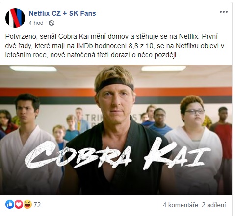 Kdo z vás viděl film Karate Kid, možná zná tento seriál, který je jakýmsi pokračováním. Na facebookové stránce Netflix CZ + SK fans se objevila informace, že se Cobra Kai chystá na Netflix, a to už v tomto roce. Třetí série pak prý „přijde o něco později“. Seriál má na čsfd.cz hodnocení 86 % a platí za 247. nejlepší seriál. Jakmile dorazí na Netflix, dáte mu šanci?