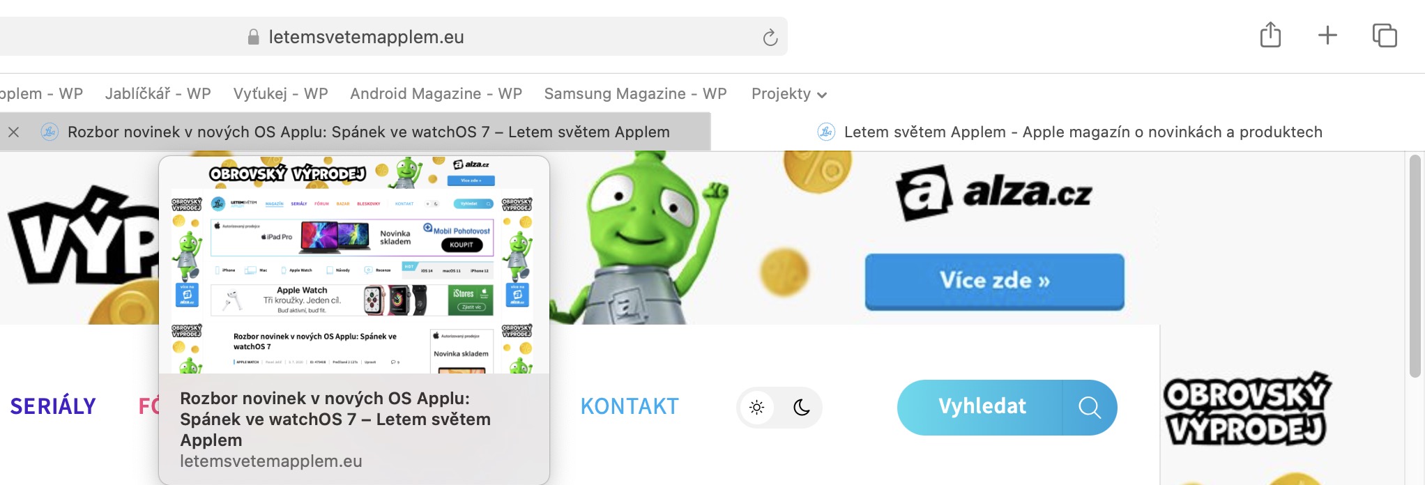V dnešní době už je naprosto normální, že lidé pracují ve vícero panelech. Při každodenním pracování se může bez problémů stát, že těchto panelů otevřete najednou hned několik desítek, a tak můžete rychle ztratit přehled. Apple se konečně rozhodl, že ve výchozím nastavení aktivuje zobrazení ikonek webů. Mezi několika otevřenými panely se tak konečně můžeme orientovat o mnoho jednodušeji. Další skvělou funkcí, která vám v orientování pomůže, je možnost zobrazení náhledu panelu. Pokud chcete zjistit, co se na určitém panelu nachází, tak stačí, abyste na něj najeli kurzorem a chvíli počkali. Poté se zobrazí malé okénko s náhledem a vy tak ihned zjistíte, zdali se jedná o tu stránku, kterou potřebujete, či nikoliv. Změny se dočkalo také tlačítko pro vytvoření nového panelu, které už se nachází mimo řádek otevřených panelů. Konkrétně se nachází o něco výše, vedle tlačítka pro sdílení.