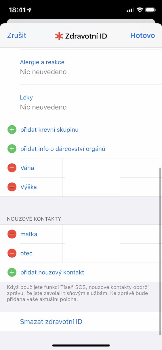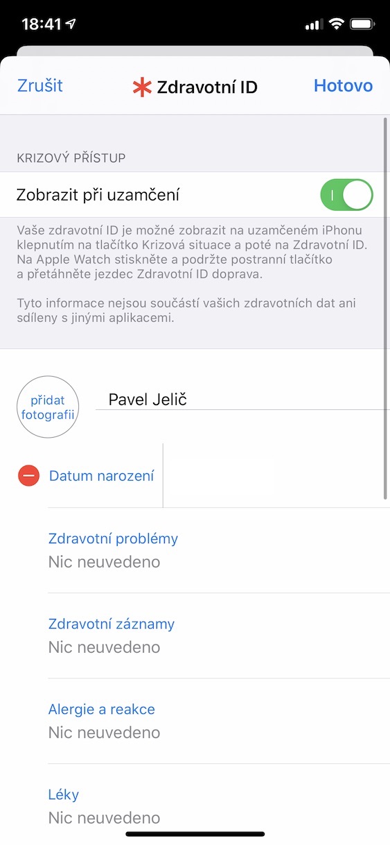 Zdravotní ID by měl mít na iPhonu nastavené opravdu každý. Svým způsobem se jedná o jakousi kartu, ve které najdete informace o zdraví a zdravotním stavu. Kromě data narození, jména a příjmení se zde zapisuje například váha, výška, nouzové kontakty, zdravotní problémy, zdravotní záznamy, alergie, reakce, anebo léky. K dispozici je také možnost pro nastavení krevní skupiny anebo info o dárcovství orgánů. Na iPhonu Zdravotní ID nastavíte následovně: