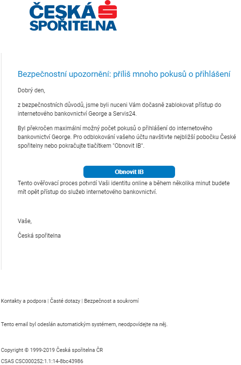 Phishingové útoky jsou tady s námi již po dobu několika dlouhých let a v roce 2020 došlo k jejich ještě většímu rozšíření. Hackeři se v rámci phishingových útoků snaží získat nějaká vaše osobní data, nejčastěji přihlašovací jména a hesla k aplikacím, službám či bankovnictví. Nejčastěji se hackeři snaží své oběti vystrašit opět tím, že se jim někdo dostal na účet, anebo že došlo k zavirování účtu. Ve zprávě vás poté odkáží na falešnou stránku určité služby, na které se poté musíte přihlásit pomocí vašich údajů. Po přihlášení se však pouze odešlou vámi zadané údaje na server hackerů, kteří se poté mohou díky tomu na pravých stránkách přihlásit k vašemu účtu. Vždy je nutné tedy sledovat, od koho vám příchozí zpráva či e-mail přišly. E-mail odesilatele ve většině případů obsahuje doménu webové stránky – kupříkladu si můžeme vzít takovou Českou spořitelnu. Webová stránka této banky je csas.cz, a tak byste měli reagovat pouze na ty e-maily, které pochází od odesilatelů s účtem xxxxx@csas.cz.