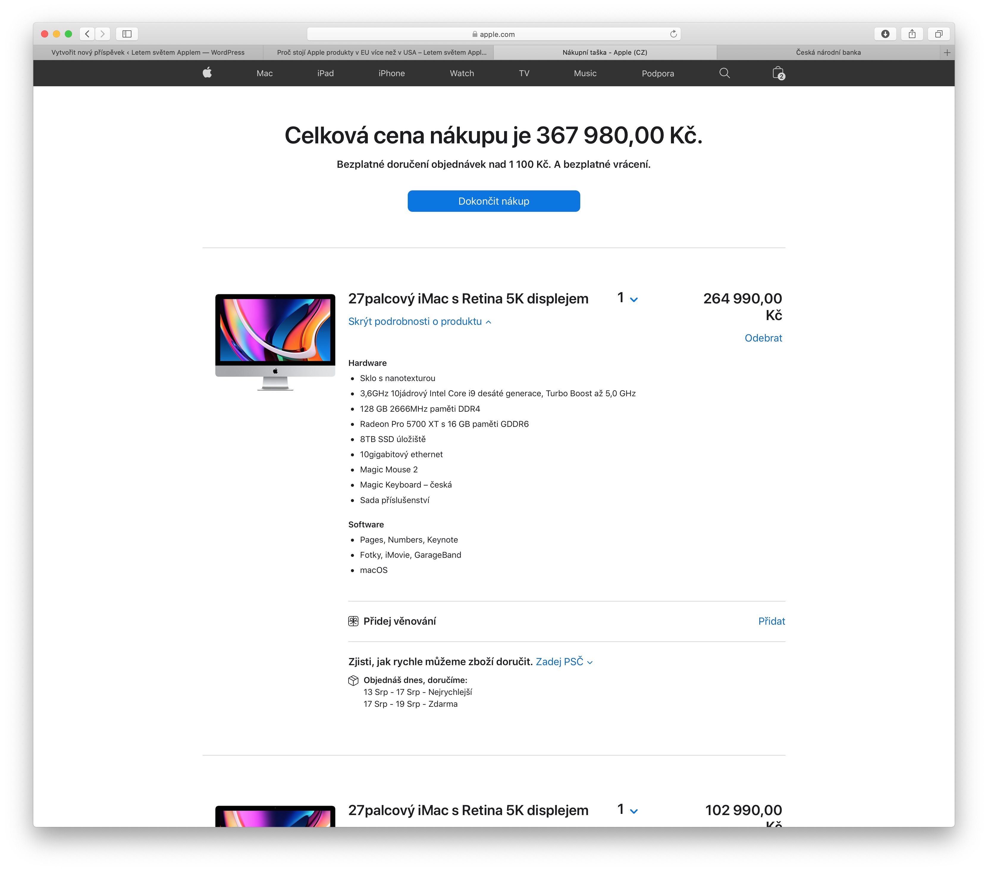 Pokud zvolíte nejdražší možnou konfiguraci nového iMac (nepočítáme příslušenství a software), dostanete se v ČR na částku 264 990Kč. Za stejnou, tedy nejvyšší možnou CTO konfiguraci iMacu v Rakousku zaplatíte 10.729€, což je v přepočtu při dnešním kurzu 281314,38, což je již rozdíl téměř 17 tisíc korun. Konečně se tedy mohou našinci radovat, že je Apple alespoň pro tentokrát nestaví do nevýhodné pozice.
