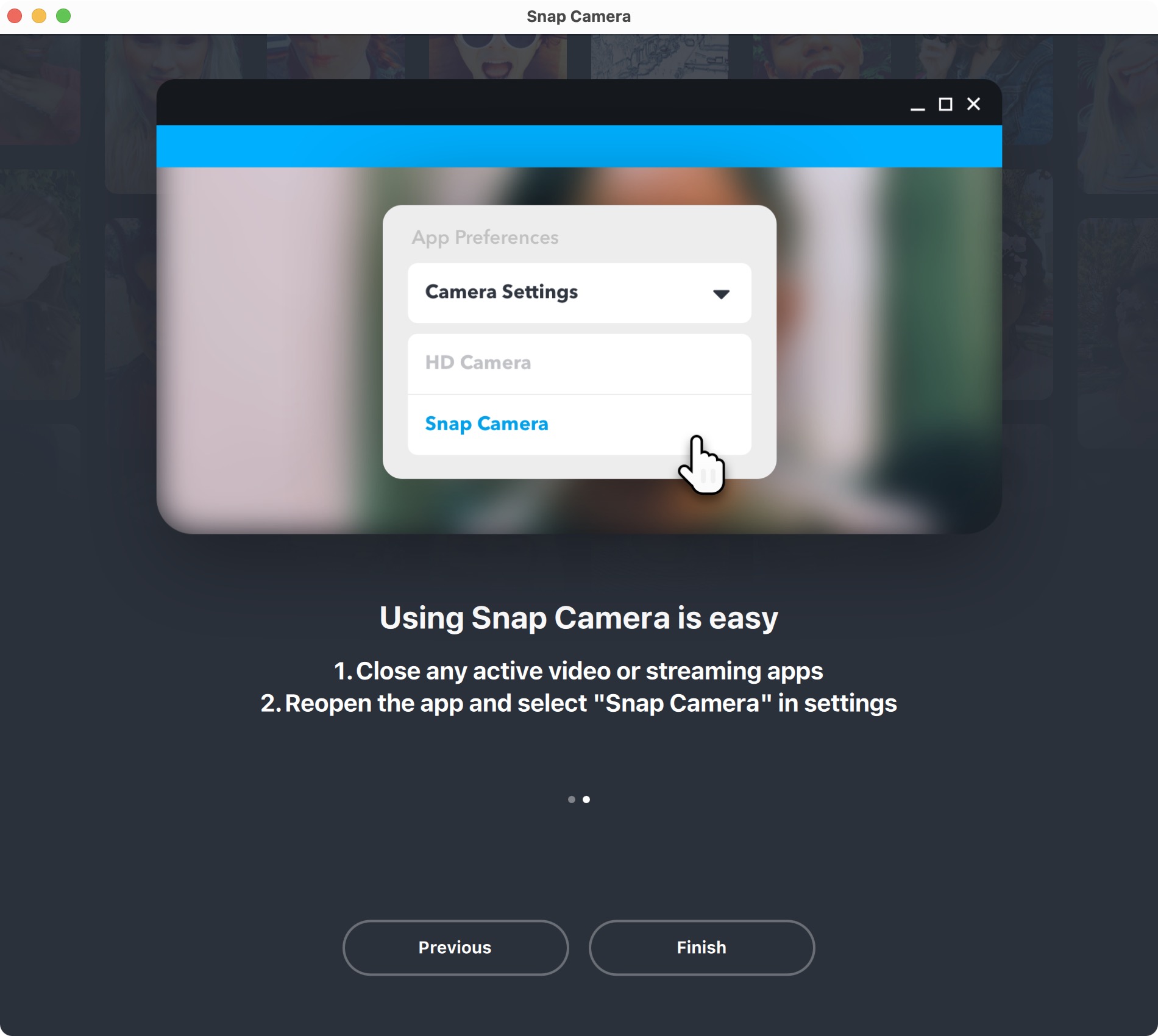 Vpravo nahoře se poté nachází ikona ozubeného kola, které slouží pro přechod do nastavení aplikace. Zde si můžete zvolit vstupní kameru, pokud používáte například externí, společně s dalšími možnostmi pro úpravu obrazu či správu cache. Snap Camera funguje jakožto jakási „virtuální kamera“, která prvně snímá klasický obraz z vaší webkamery, který následně zpracuje (přidá filtr) a po zpracování jej vysílá dál prostřednictvím další kamery, která nese název Snap Camera. Jakmile si vše nastavíte, tak už vám nezbývá nic jiného, než Snap Cameru nastavit jakožto hlavní kameru ve vaší oblíbené aplikaci pro video hovory, například Skype, Zoom či Google Hangouts – nejčastěji tuto předvolbu najdete v sekci Nastavení, Zvuk a video, apod. Pokud se Snap Camera jakožto zdroj videa neobjeví, tak je nutné aplikaci pro video hovory restartovat, v některých případech je nutné restartovat i samotné macOS zařízení.
