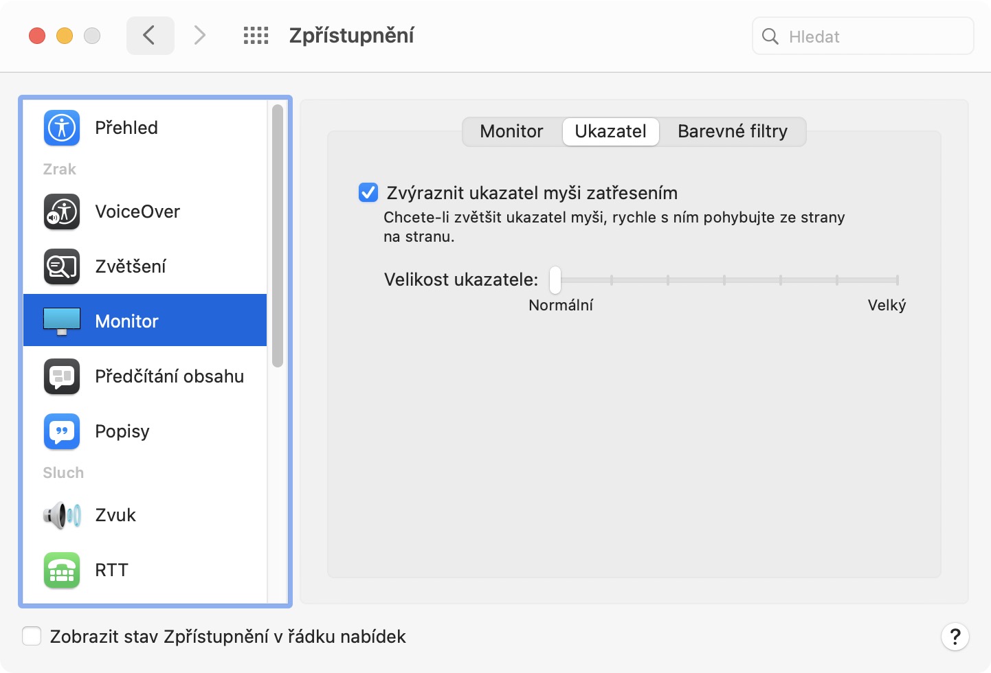 Nyní, kdykoliv v rámci vašeho Macu či MacBooku začnete zběsile pohybovat kurzorem, tak se ukazatel na několik okamžiků zvětší, abyste jej na velké pracovní ploše mohli najít. V případě, že byste chtěli kurzor všeobecně zvětšit, jelikož na něj například nevidíte, tak můžete. Stačí se přesunout do stejné sekce, tedy do Předvolby systému -> Zpřístupnění -> Monitor -> Ukazatel. Zde už si stačí pomocí posuvníku vedle textu Velikost ukazatele nastavit, jak velký váškurzor bude.