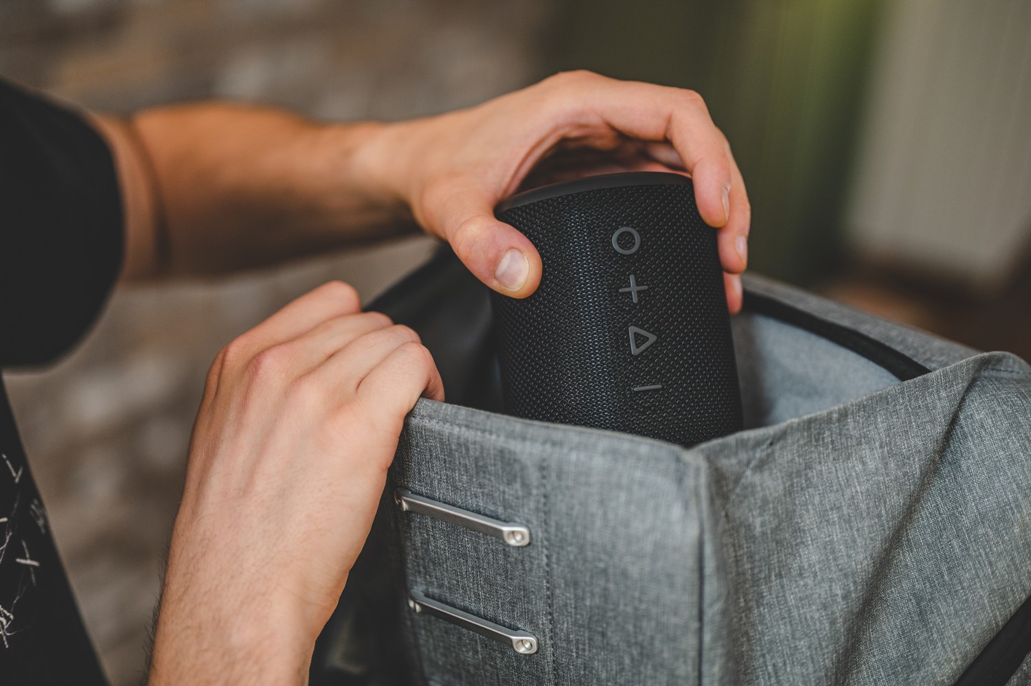 Jako vždy ale prvně nahlédneme do obsahu balení. V krabičce kromě reproduktoru naleznete také manuál, USB-C kabel a kabel s 3,5 mm jack koncovkami . Samotný reproduktor vás vzhledem opravdu nepřekvapí, jelikož razí styl klasického válce. Na „přední straně“ můžete vidět čtyři tlačítka, která slouží k zapnutí/vypnutí, přehrávání/pozastavení skladby, přijetí/odmítnutí/ukončení hovoru, zvýšení/snížení hlasitosti a k posunu skladeb. Jak tedy vidíte, když reproduktor hraje, odpadá prakticky nutnost brát smartphone do rukou. Na horní straně pak naleznete tlačítko zvané Magic Button, jež slouží k přepínání režimů. Pokud jej stlačíte, zapne se režim se zesílenými basami, což je stvrzeno tím, že kolečko po svém obvodu svítí. Na zadní straně pak naleznete poutko a krytku, po jejímž odejmutí vidíte konektor USB-C pro nabíjení, USB -A pro vložení vašeho flashdisku (reproduktor podporuje formáty MP3, WMA, WAV, APE, FLAC) a 3,5 mm konektor. Reproduktor rovněž dokáže fungovat jako powerbanka. Niceboy RAZE 3 Guru je vyhotoven z umělé hmoty, obzvláště příjemná je pak kovová mřížka po obvodu.