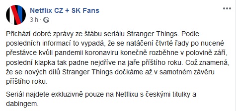 Kvůli koronaviru se pozastavilo natáčení mnoha seriálů. Stranger Things nebyl výjimkou. Dobrou zprávou ovšem je, že natáčení započne zřejmě už v polovině září. Dotočen by tak mohl být někdy na jaře, což znamená, že na naše obrazovky by se mohl dostat snad závěrem příštího roku, o čemž informovala facebooková skupina Netflix CZ + SK Fans. Viděli jste tento seriál?