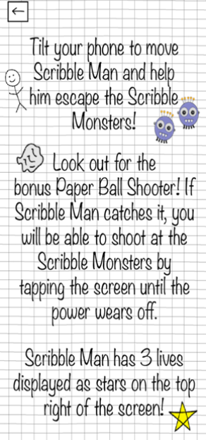 Kdo by si někdy nečmáral do sešitu nebo poznámkového bloku? Ve hře Scribble Escape ale kresby a čmáranice v Nickově sešitě na matematiku zničehonic ožívají. Vaším úkolem bude naklánět displej vašeho iPhonu tak, aby se nakreslená postavička jménem Scribble Man co nejdéle dokázala vyhýbat hladovým a zákeřným Scribble Monsters. Máte tři životy – a po ruce také užitečný bonus v podobě střílecího papírového balonku.
