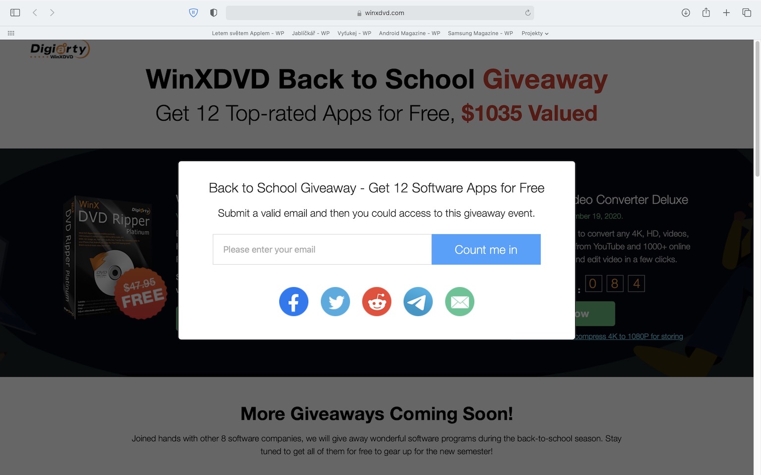 Pokud máte o výše uvedené programy zájem a chcete si je stáhnout zdarma, tak stačí, abyste se přesunuli na stránky akce. Jakmile tak učiníte, tak se vám otevře malé okno. Do textového pole v tomto okně zadejte vaši e-mailovou adresu, popřípadě se přihlaste pomocí jedné ze sociálních sítí, a poté je hotovo. Nutno podotknout, že každý den je k dispozici pouze 1000 kopií, které velmi rychle mizí. Vždy je tedy nutné si pospíšit, aby se dostalo i na vás. V případě, že se do první vlny 1000 kopií nevlezete, tak nezoufejte. U jednotlivého programu se vždy nachází časový údaj, kdy bude k dispozici dalších 1000 kopií – stačí si tedy nastavit připomínku a program poté jednoduše stáhnout zdarma. K dispozici jsou jak programy pro Windows, tak programy pro macOS.