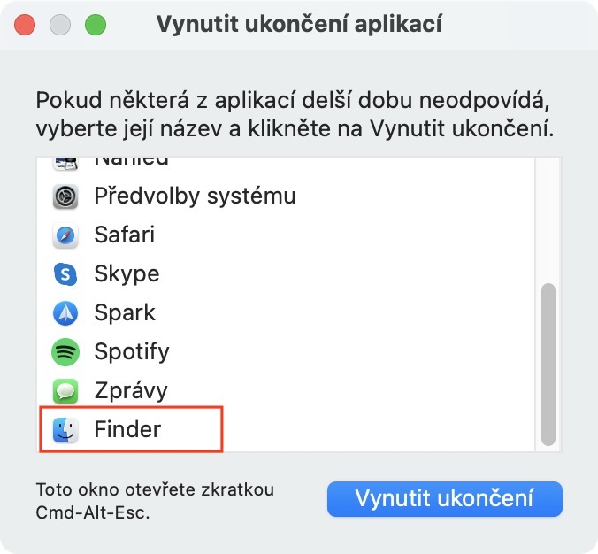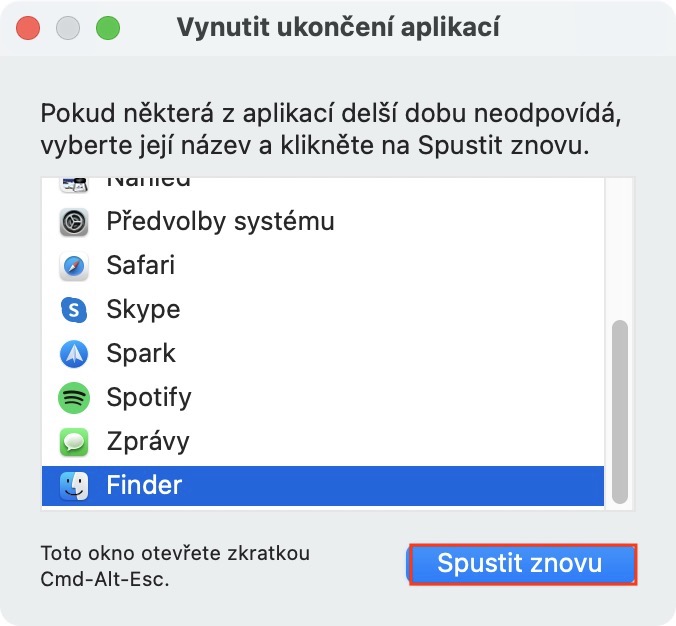 Někteří uživatelé macOS ani netuší, že se v tomto systému nachází jakýsi „správce úloh“ z konkurenčního operačního systému Windows. Právě v tomto správci úloh můžete Finder vcelku jednoduše resetovat. Pro spuštění správce úloh stiskněte na klávesnici kombinaci kláves Command + Option + Escape. Jakmile tuto klávesovou zkratku stisknete, tak se otevře nové okno se všemi aktivními úlohami. Zde poté označte Finder a v pravém dolním rohu klepněte na tlačítko Spustit znovu. Tímto se Finder restartuje a vy byste měli být schopni jej opět bez problémů začít používat.
