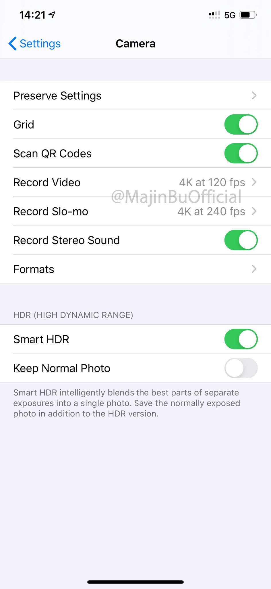 Screenshoty z iPhonu 12, které se nyní dostaly na veřejnost, sdílel na svém Twitteru jako první uživatel @MajinBuOfficial, který se v minulosti již několikrát podobným kouskem blýskl. Snímky obrazovky zachycují konkrétně rozhraní pro nastavení fotoaparátu a mobilních dat, do kterých přibyla k položce 3G a 4G položka 5G. Tu Apple v nastavení popisuje jako možnost pro zrychlení datového připojení a zlepšení kvality hlasu při hovorech. Co se pak týče nastavení fotoaparátu, to odhaluje například možnost natáčení 4K ve 120fps či slo-mo 4K ve 240fps. Je nicméně možné, že se nejedná o nejvyšší možné nastavení fotoaparátu.