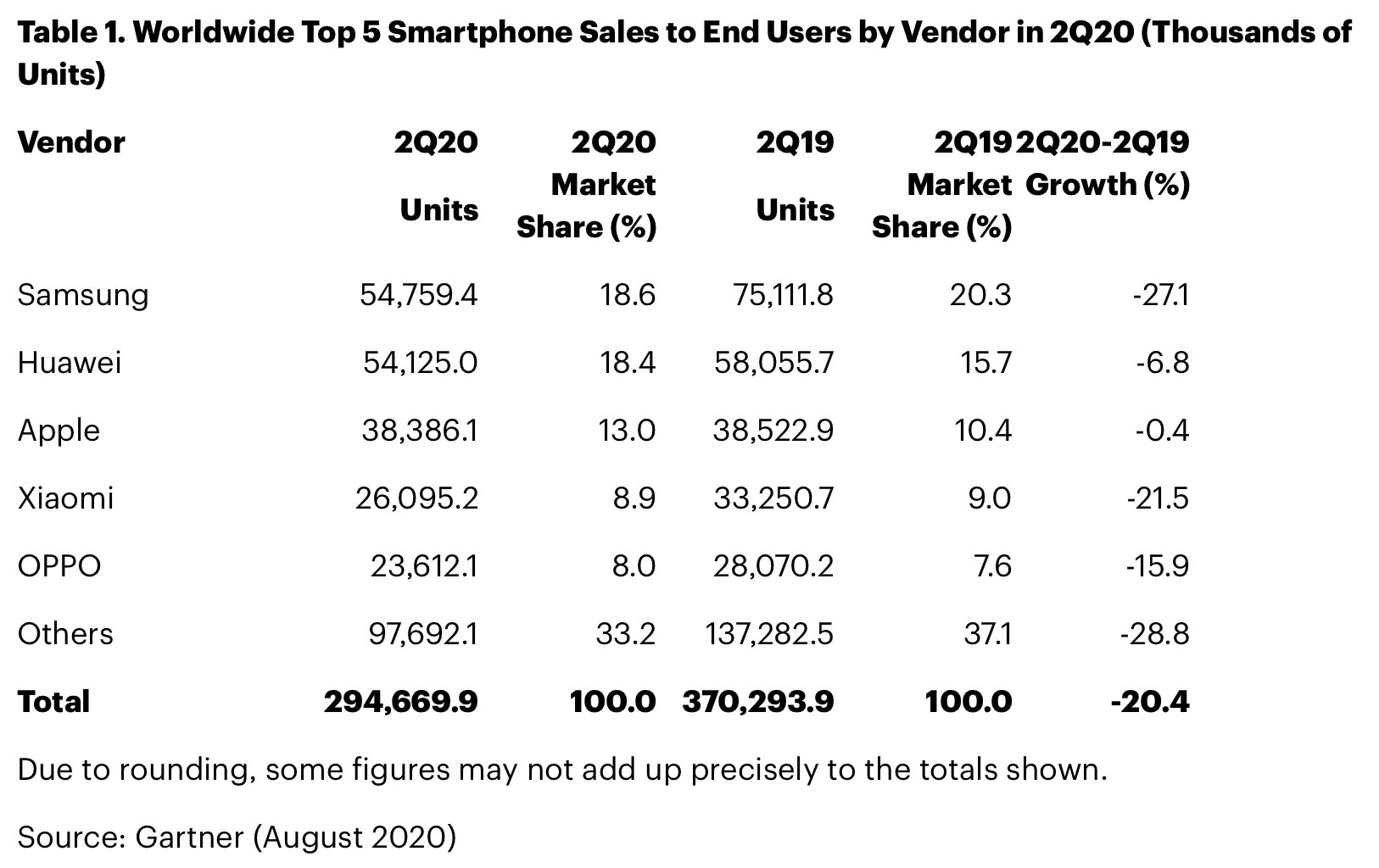 Vraťme se nicméně zpět k počtu dodaných kusů, které společnost Gartner odhalila. Zatímco Samsung, který dosud statečně držel první příčku v žebříčku tržního podílu, propadl meziročně během druhéh kvartálu o 27.1% a zažil takřka největší pokles za posledních několik let, počet dodaných kusů smartphonů z dílny Huawei poklesl o nemalých 6.8% s tím, že čínský gigant prodal zhruba 54 miliony kusů. O to pozoruhodnější byl právě vysledek Applu, který se meziročně dočkal pouze 0.4% propadu a dodal 38 miliony iPhonů, tedy zhruba stejně jako minulý rok. Neslavně na tom oproti jablečné společnosti bylo i Xiaomi, kterému se sice v Číně vede skvěle, ale zejména výsledky na západě se podepsaly na 21.5% propadu. Tak či onak se jedná opět o působivý výsledek Applu a nezbývá než doufat, že další čtvrtletí na tom budou jen lépe. Konec konců, celosvětová ekonomika se více méně rozběhla, Apple Story opět otevřely a dá se očekávat, že se prodeje navrátí k normálu.