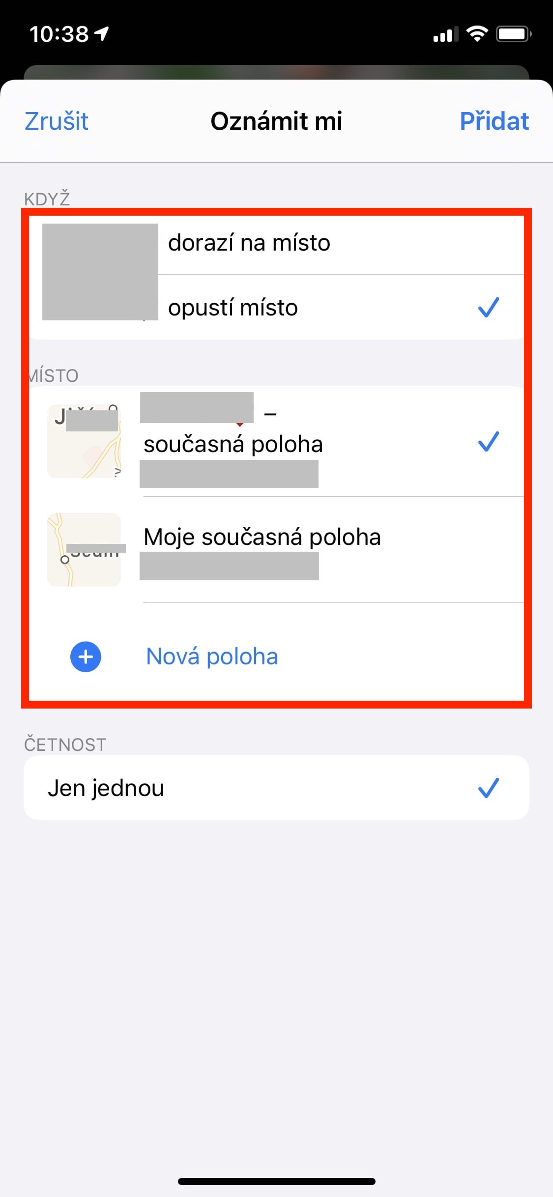 - Nyní si vyberte, zdali vám má přijít oznámení tehdy, pokud osoba dorazí či opustí určité místo.
