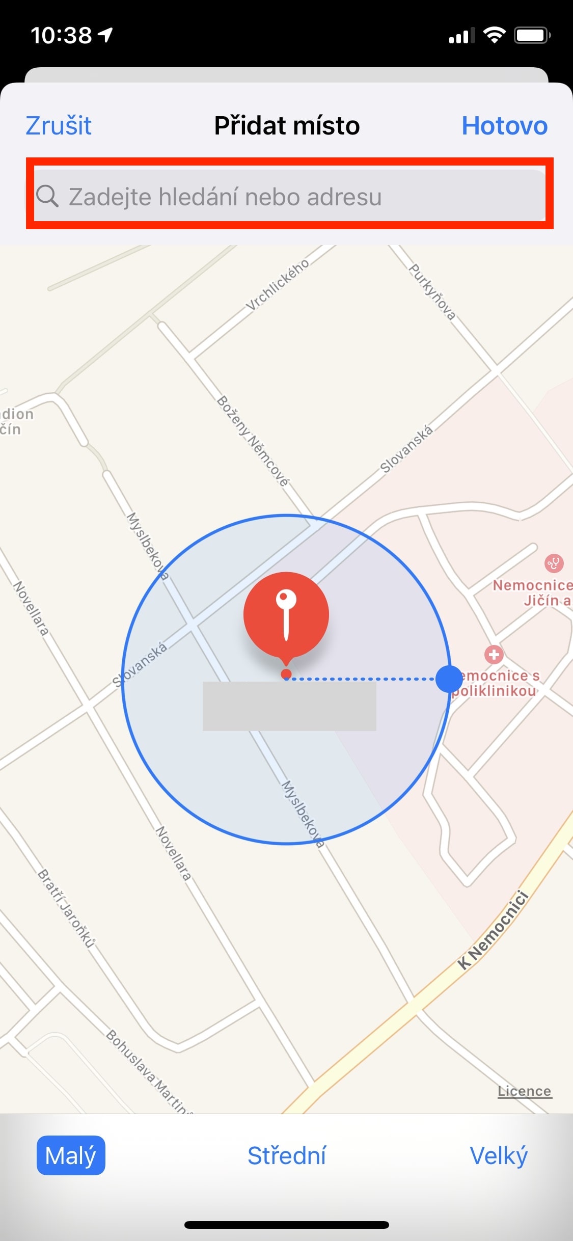 - Nyní vyhledejte místo či adresu a ve spodním menu si zvolte, o jak velkou oblast se má jednat. Nakonec klepněte na Hotovo.