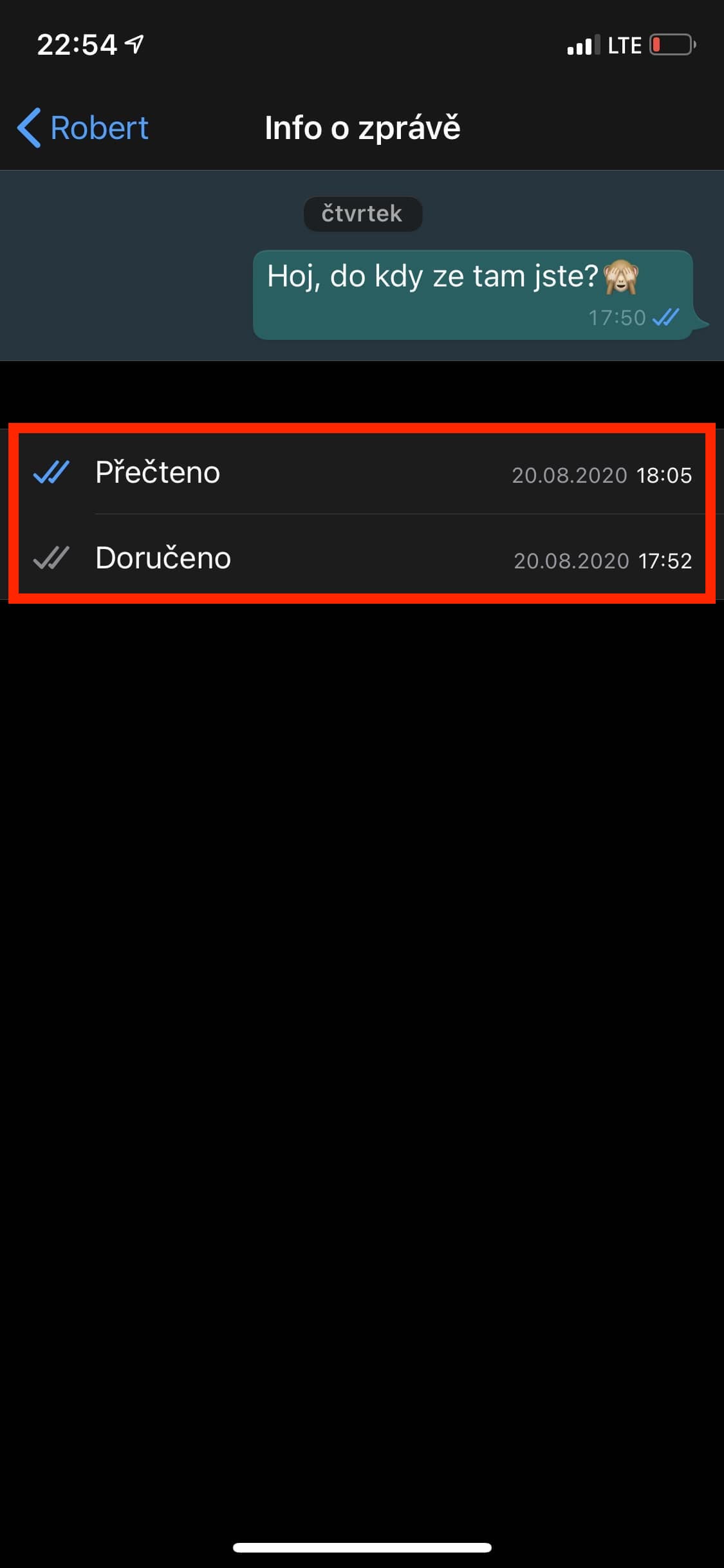Pokud jste někomu odeslali zprávu a dotyčný si ji zobrazil, tak se vám vedle ní zobrazí modrá fajfka – samozřejmě, pokud dotyčný nemá deaktivované potvrzení o přečtení, viz výše. V některých případech nás dokáže tato modrá fajfka pěkně naštvat, například kvůli tomu, že potřebujete rychlou odpověď na jednoduchou otázku, avšak druhá strana vám ji jednoduše neposkytne. V rámci WhatsAppu si můžete jednoduše zobrazit čas u veškerých stavů, kterými si určitá zpráva prošla. Kromě toho, že si můžete zobrazit, kdy došlo k přečtení zprávy, tak si můžete zobrazit také čas jejího doručení. Pokud chcete tyto časy zobrazit, tak se nejedná o nic složitého. Stačí, abyste si našli konkrétní zprávu, u které chcete tato data zobrazit, a poté po ní přejeli prstem zprava doleva. Otevře se nové okno, kde už se o čase můžete přesvědčit a popřípadě zjistit, jak dlouho vás osoba ignoruje.