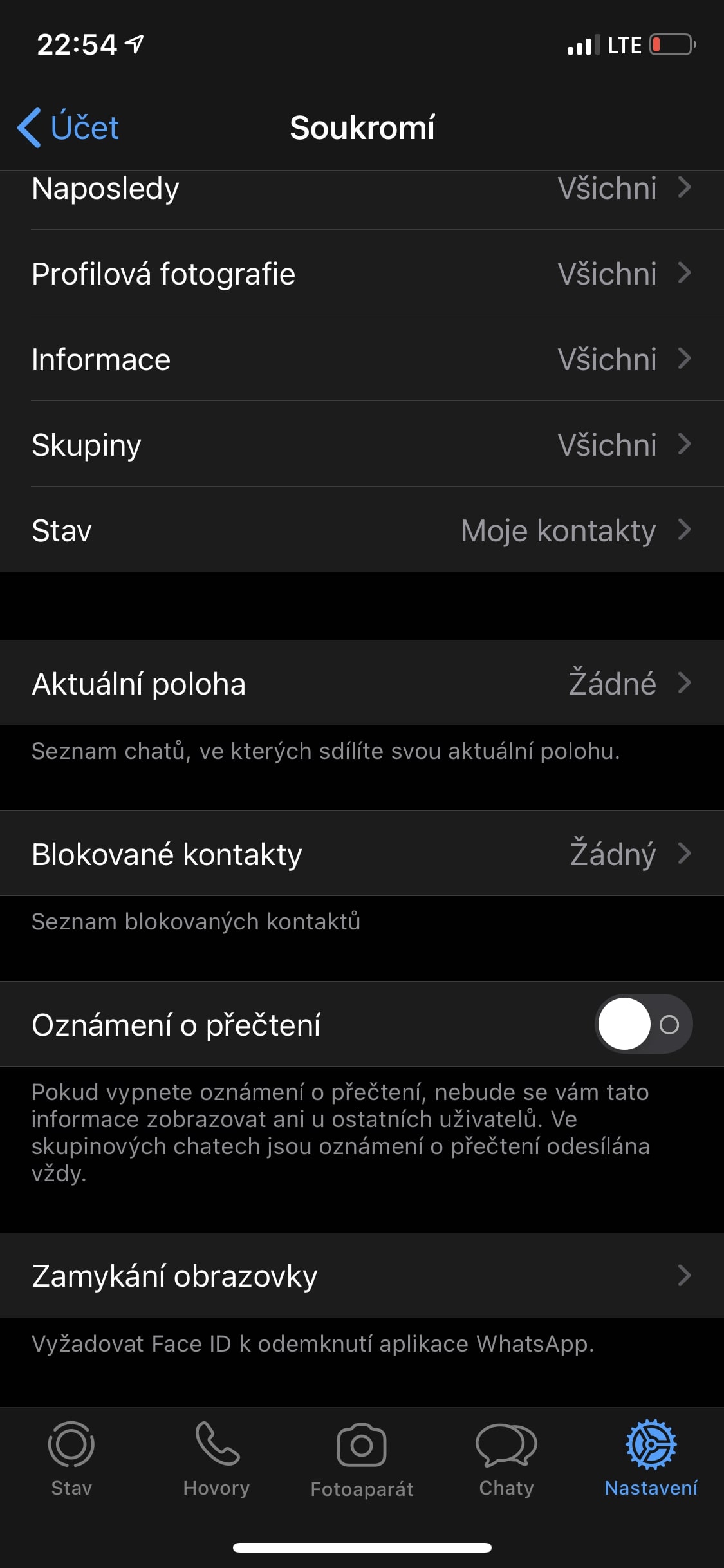 V případě, že si zobrazíte od nějakého uživatele zprávu, kterou vám napsal, tak se mu u zprávy zobrazí modrá fajfka. Tak stejně se modrá fajfka objeví vám, pokud někomu pošlete zprávu a dotyčný si ji přečte. Co si budeme nalhávat, určitě se alespoň jednou každý z nás kvůli této modré fajfce dostal do potíží, a to kvůli tomu, že jsme si zprávu zobrazili, ale nebyli jsme schopni odpovědět. Někdy neodpovídáme schválně, jindy zase neodpovídáme jednoduše tehdy, jelikož jsme na zprávu zapomněli. V rámci WhatsAppu však naštěstí existuje možnost, pomocí které si můžete potvrzení o přečtení zpráv, tedy modré fajfky, deaktivovat. Deaktivace však probíhá ve stylu všechno anebo nic – buď tedy provedete deaktivaci a modré fajfky neuvidíte ani vy, ani druhá strana, anebo naopak. Neexistuje možnost, pomocí které byste si mohli zobrazit potvrzení o přečtení od druhé osoby, zatímco by tato druhá osoba neviděla to, že jste si její zprávu přečetli. Pro deaktivaci potvrzení o přečtení se ve spodním menu WhatsAppu přesuňte do Nastavení, kde klepněte na kolonku Účet. Poté se přesuňte do sekce Soukromí, kde pomocí přepínače deaktivujte Oznámení o přečtení.