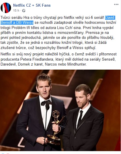 Zřejmě se máme na co těšit. Knižní trilogie Problém tří těles od autora Liou Cch‘-sina se dočká seriálu, na kterém mají pracovat David Benioff a DB Weiss, tedy jedni z tvůrců Hry o trůny. Skvěle hodnocená knižní trilogie má pojednávat o kontaktu lidstva s mimozemšťany. Na seriálu má pracovat i producent Peter Friendlander, jenž dohlížel na seriály jako House of Cards, Narcos, Mindhunter nebo Sense 8. Snad se seriálu dočkáme již brzy. O této zprávě informovala facebooková skupina Netflix CZ + SK Fans.