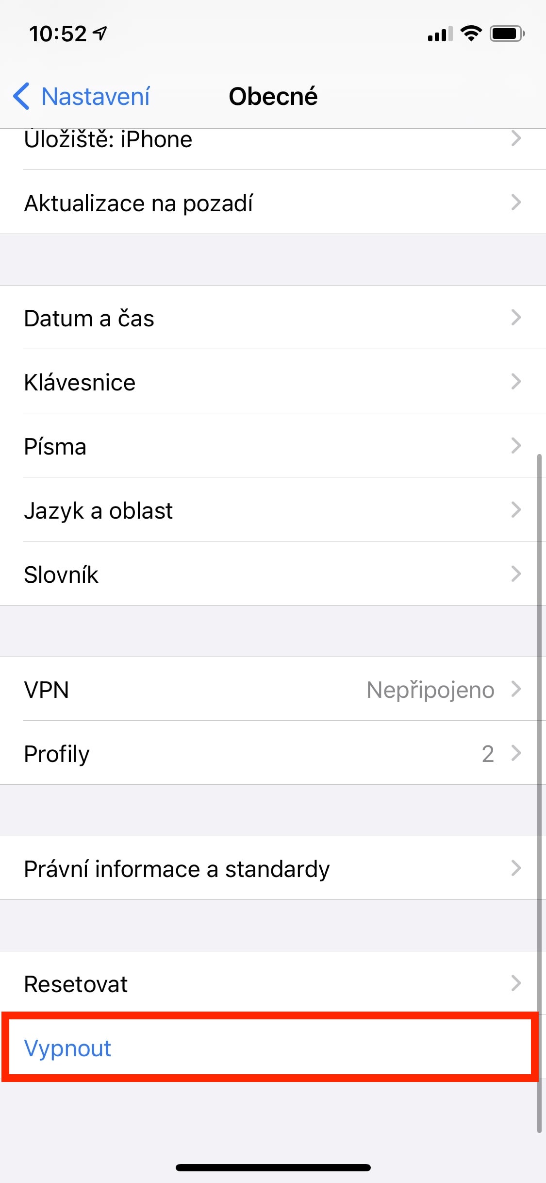 • Tady už jen stačí, abyste sjeli úplně dolů, kde se nachází tlačítko Vypnout.