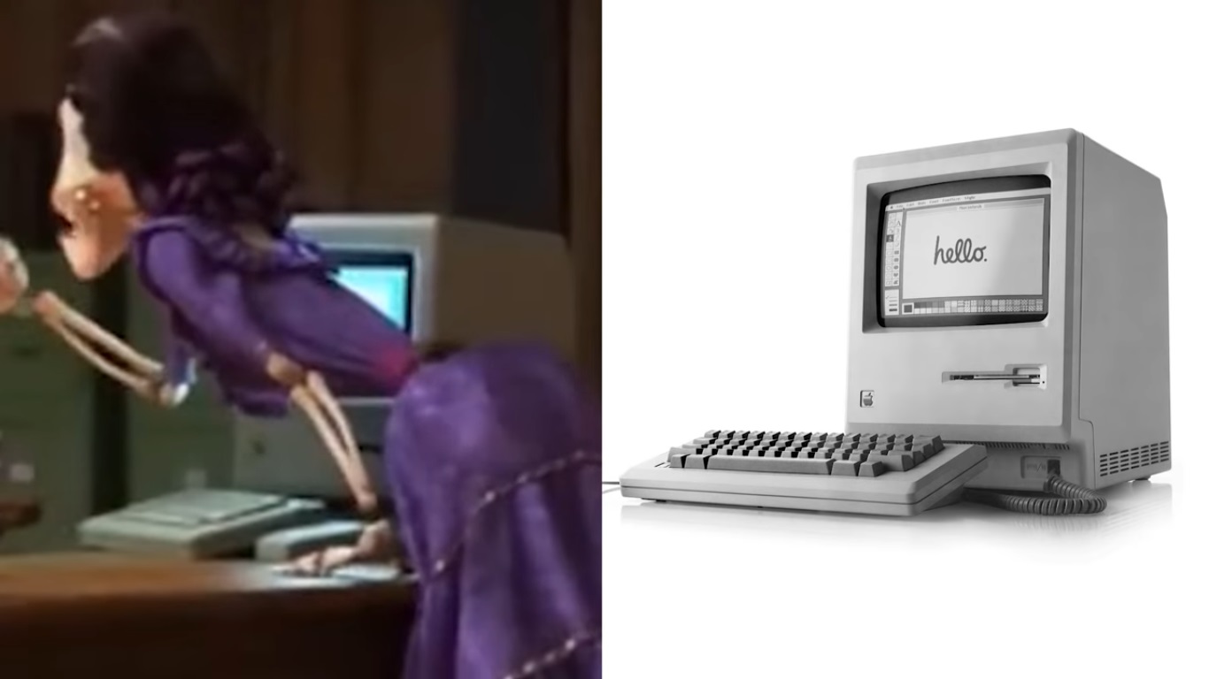 Mamá Imelda se snaží zjistit, proč nemůže Zemi mrtvých opustit a navštívit svou rodinu. Pokud se v této scéně zaměříte na stůl, uvidíte počítač, který jako by z oka vypadl starému Macintoshi 128K.