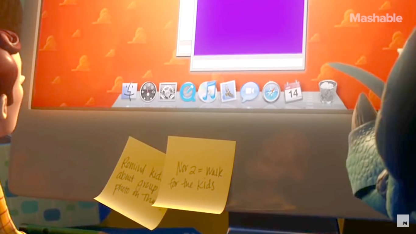V jedné ze scén jsou hračky u stolu a hledí do počítače. Ne ale do ledajakého. Při pohledu na obrazovku můžete nápadně vidět iMac s macOS.
