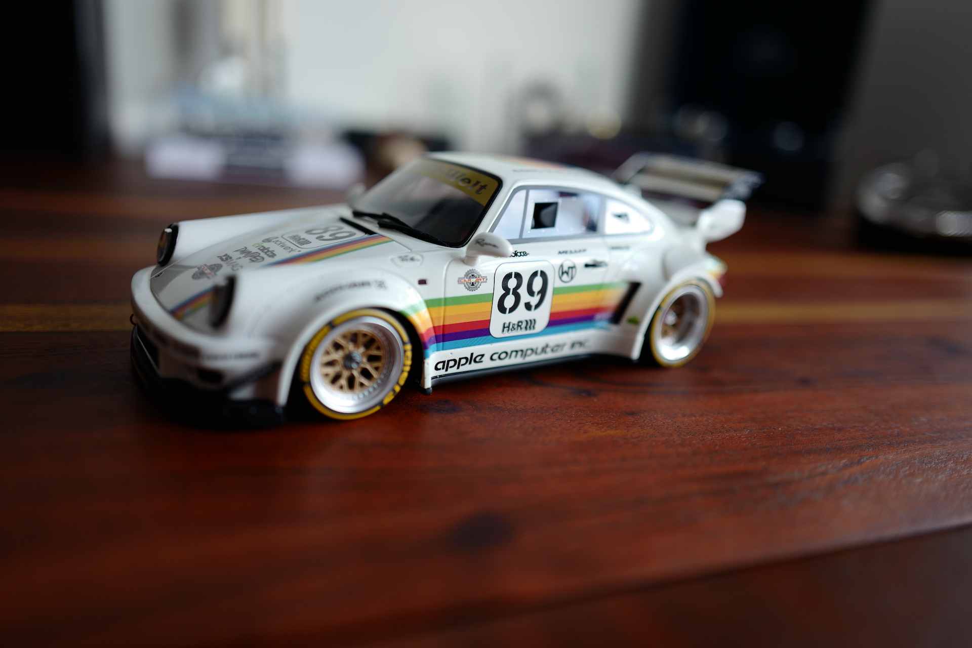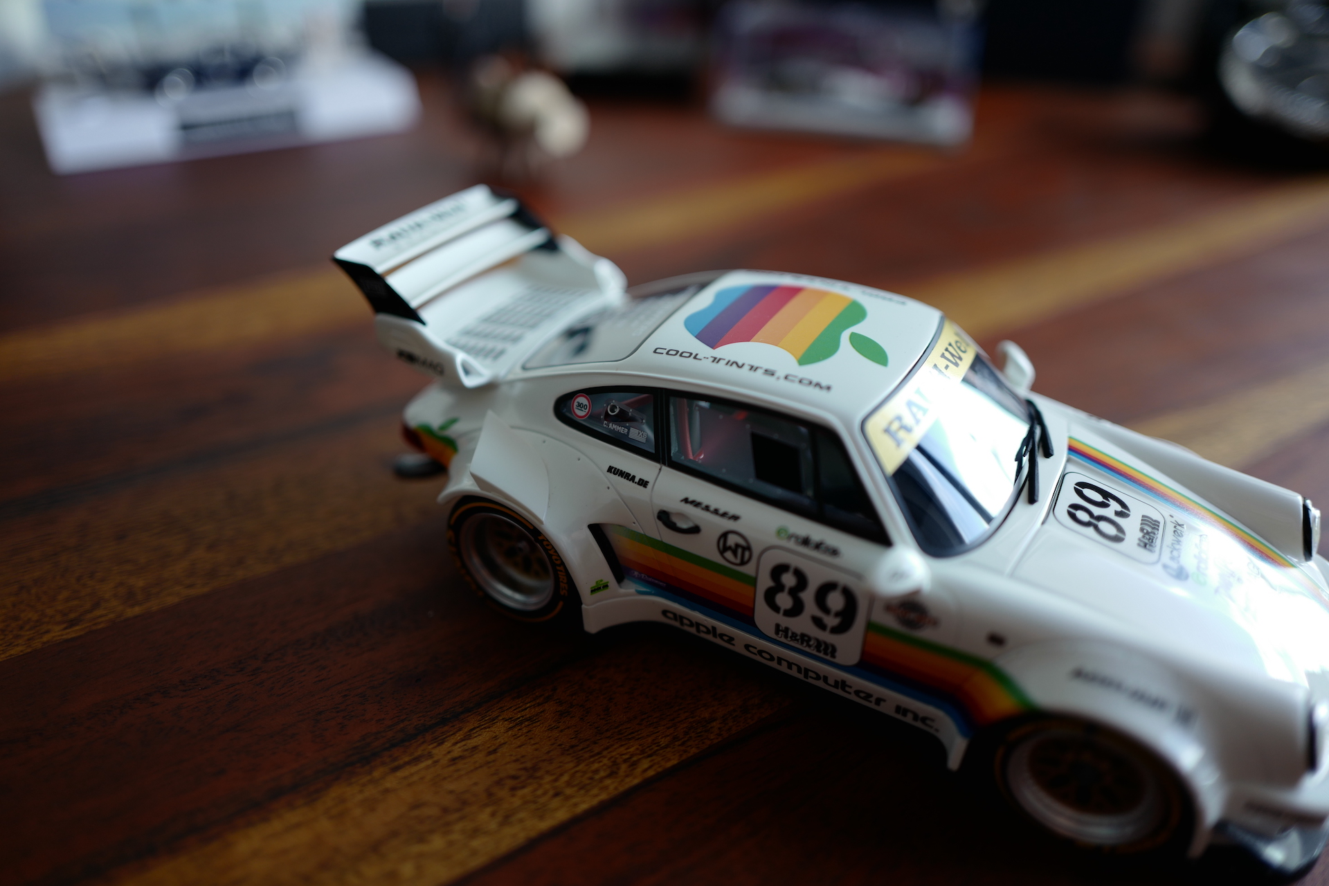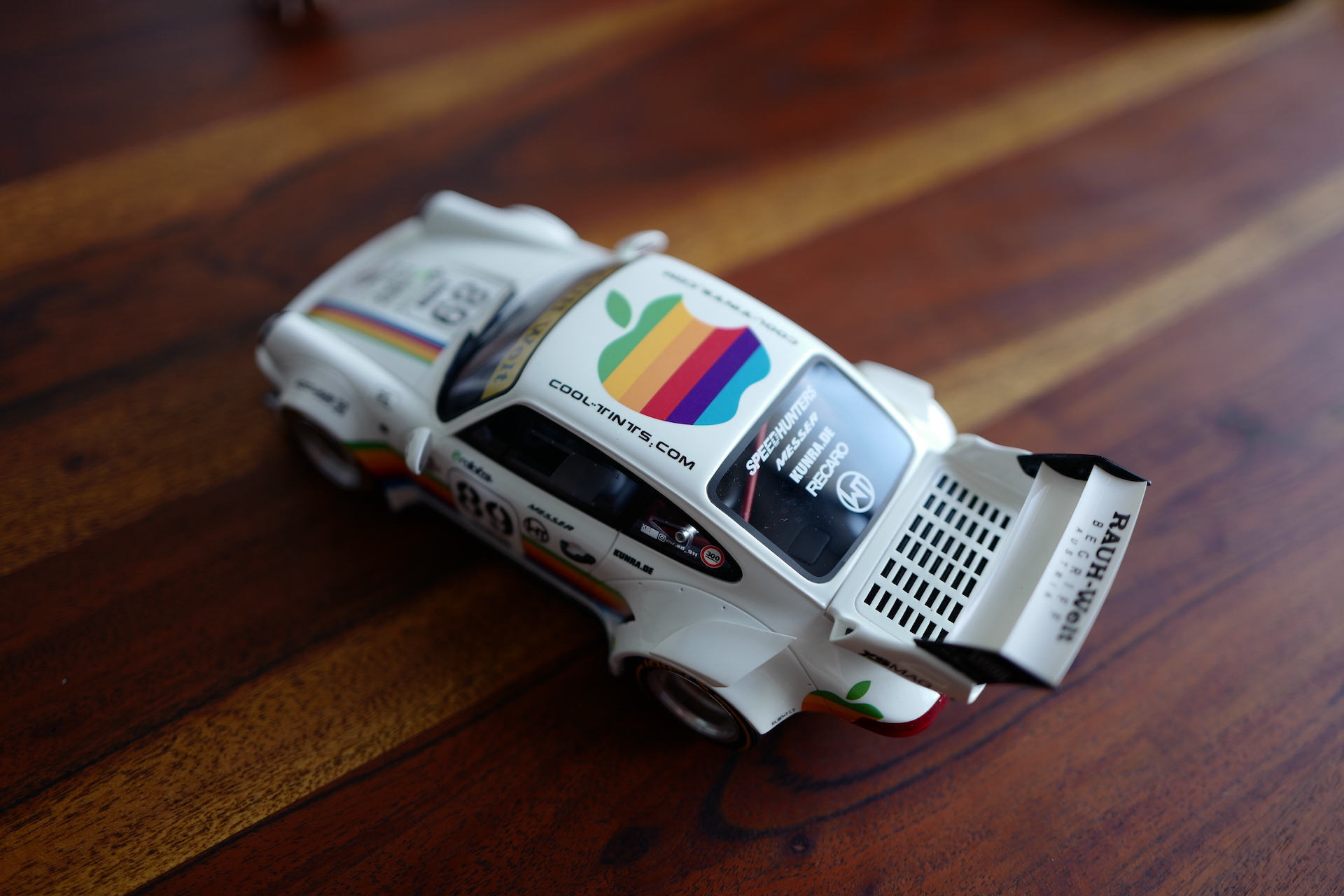 Díky spojení Applu a Porsche tak vznikl jediný exemplář legendárního vozu, kterým se inspiroval známý japonský génius Akira Nakai, aby vytvořil spolu se svou značkou RWB speciálně upravenou civilní verzi Porsche 935, která vychází právě z tohoto závodního speciálu. RWB se specializuje na úpravy vozů značky Porsche a jedná se ve světě tuningu o velký pojem. Právě díky tomu se tak stalo něco téměř neuvěřitelného a RWB se podařilo vytvořit vůz, který nejenže je inspirovaný legendou, ale sám se legendou stal. A aby to nebylo nám fanouškům Applu, Porsche a RWB líto, přišla společnost GT Spirit s modelem RWB Apple Porsche v měřítku 1:18, který mi jako správnému milovníkovi aut a Applu musel přistát na stole.