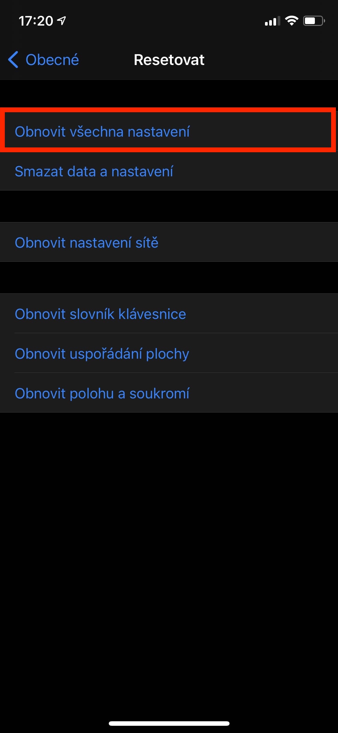 Pokud se vám ani jedním výše uvedeným způsobem nepodařilo iPhone ze zaseknutého režimu sluchátek dostat, tak je na řadě nejradikálnější možnost – reset do továrního nastavení. Pokud reset do továrního nastavení provedete, tak přijdete o veškerá nastavení a předvolby vašeho iPhonu. Dobrou zprávou je, že v tomto případě nepřijdete o uživatelská data. Reset do továrního nastavení provedete tak, že přejdete do nativní aplikace Nastavení, kde klepněte na kolonku Obecné. Zde poté sjeďte úplně dolů, rozklikněte možnost Resetovat, a poté klepněte na možnost Obnovit všechna nastavení. Akci poté stačí potvrdit, zadat kódový zámek, opět potvrdit a je hotovo.