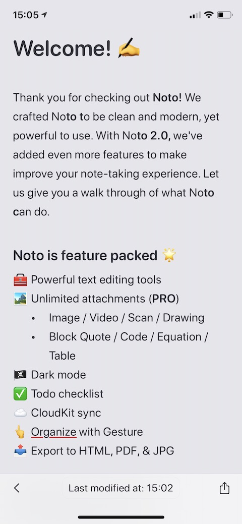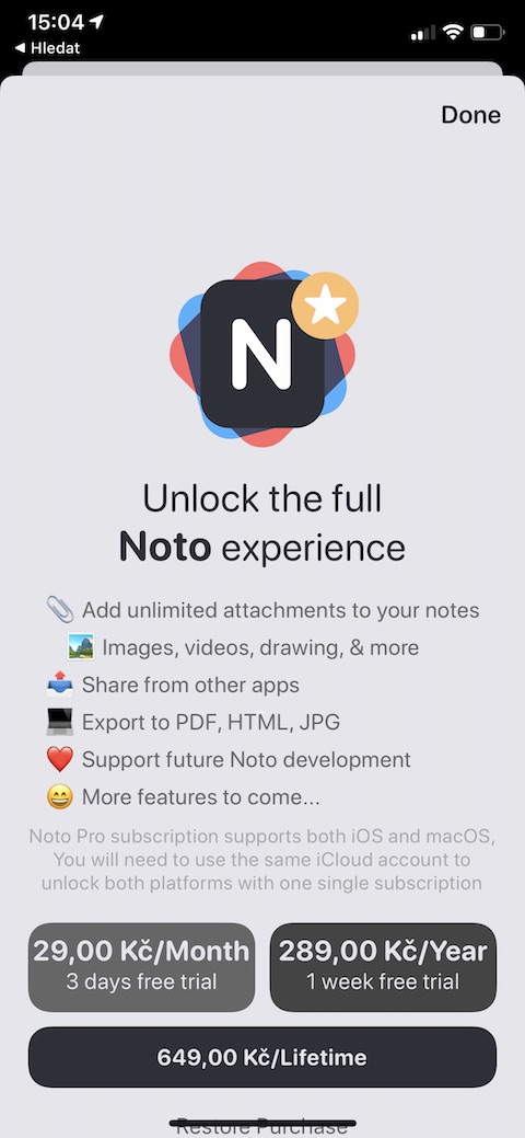 Teprve při podrobnějším procházení aplikace vás překvapí to, kolik možností a funkcí vlastně Noto nabízí. Kromě klasického zadávání poznámek umožňuje tento nástroj tvorbu seznamů úkolů, ovládání gesty a export obsahu do HTML, PDF nebo JPG formátu. Samozřejmostí jsou pomůcky pro úpravu vzhledu a stylu písma i odstavců, podpora matematických rovnic, kódů i ručního psaní, tabulek, nebo třeba ovládání gesty. Veškeré detaily ohledně fungování naleznete přehledně vysvětlené ve zmíněné vzorové poznámce. Základní funkce (obyčejné zadávání a úprava klasického textu) jsou k dispozici zdarma, v prémiové verzi aplikace Noto (29 korun měsíčně nebo 289 korun ročně s třídenní nebo týdenní bezplatnou zkušební lhůtou) naleznete funkce, jako je zmíněná podpora kódů, tabulek, rovnic, skenování dokumentů, přidávání příloh k poznámkám a řada dalších. Aplikaci Noto si můžete po designové stránce přizpůsobit podle sebe, samozřejmostí je podpora tmavého režimu a synchronizace přes iCloud.