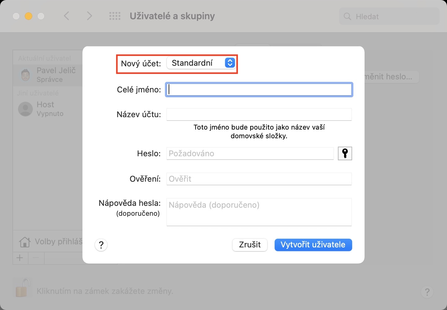 - Standardní: tento účet je vhodný pro všechny obyčejné uživatele. Standardní uživatel je schopen na Macu instalovat aplikace a měnit nastavení spojená pouze s jeho uživatelským účtem. Nemůže však žádným způsobem zasahovat do ostatních účtů. Ve většině případech při vytváření nového účtu volíte právě typ Standardní.