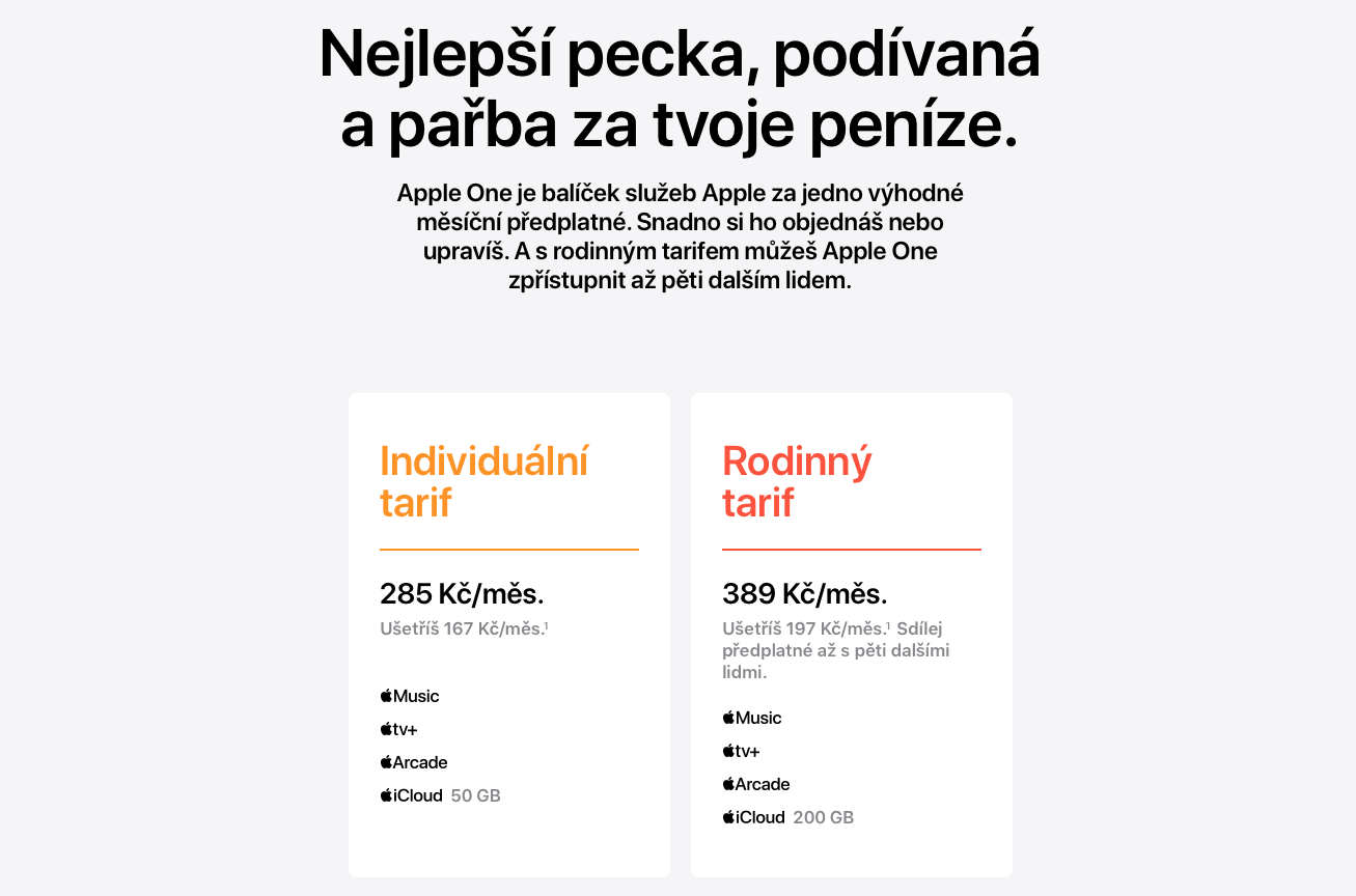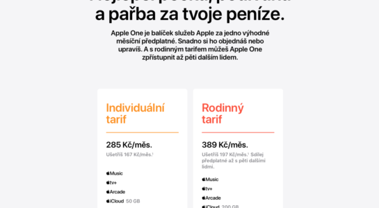 To po čem všichni fanoušci služeb od Applu dlouhé měsíce snili se stalo dnes večer skutečností. Společnost Apple představila službu Apple One, která sjednocuje všechny čtyři nabízené služby Applu do jednoho balíčku. Ten zahrnuje Apple Music, Apple TV+, Apple Arcade a iCloud. Služba bude od letošního podzimu dostupná také v ČR a to za cenu 285Kč včetně DPH v případě individuálního tarifu. V rámci individuálního tarifu dostanete předplatné Apple Music, TV+, Apple Arcade a 50GB uložiště na iCloud. Oproti tomu, když byste si služby předpláceli samostatně, ušetříte měsíčně 167Kč.