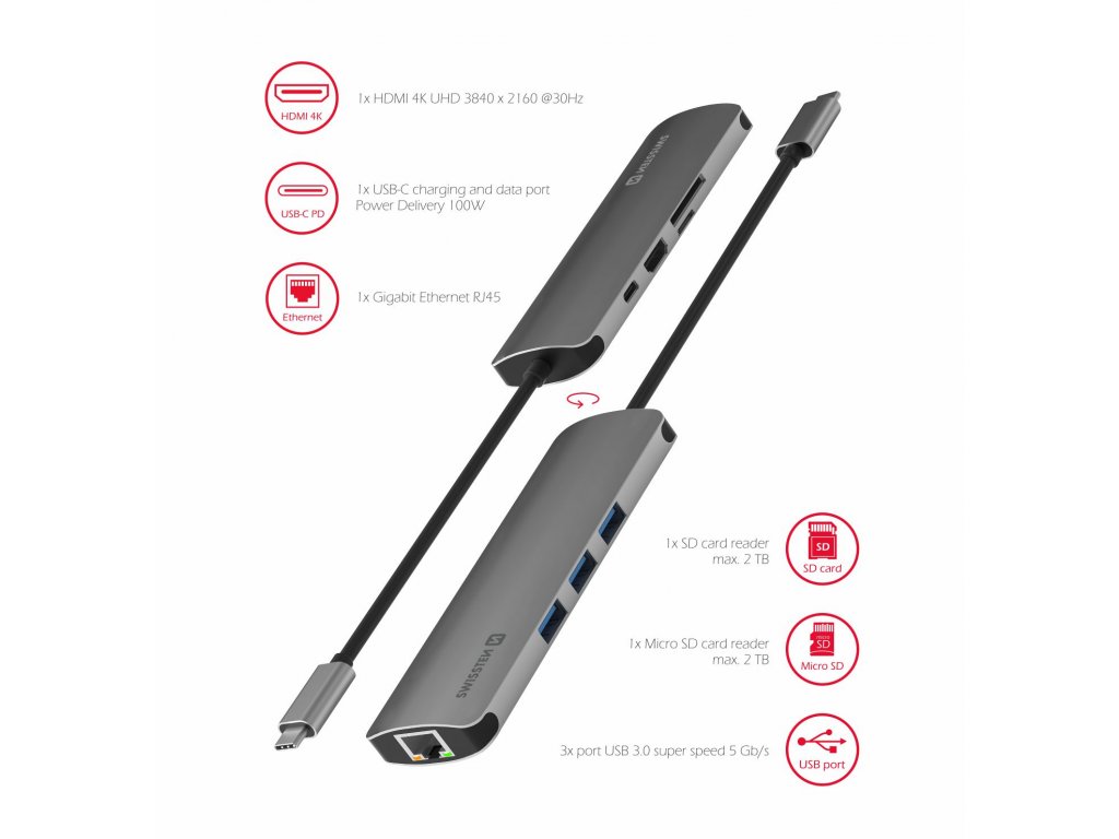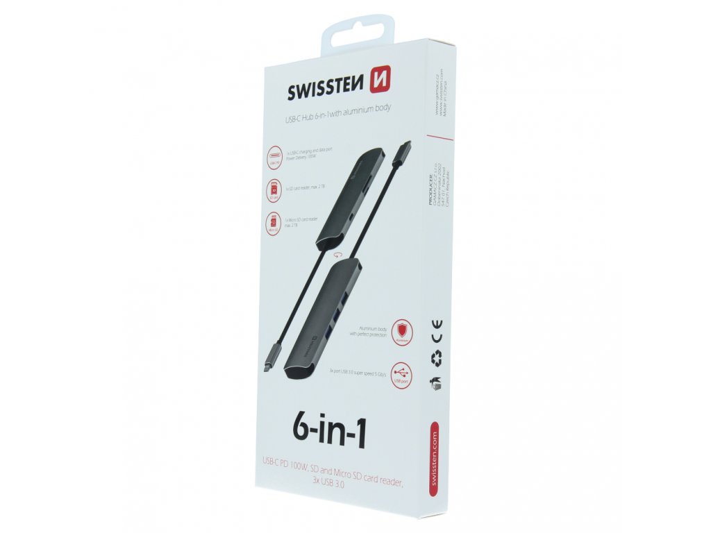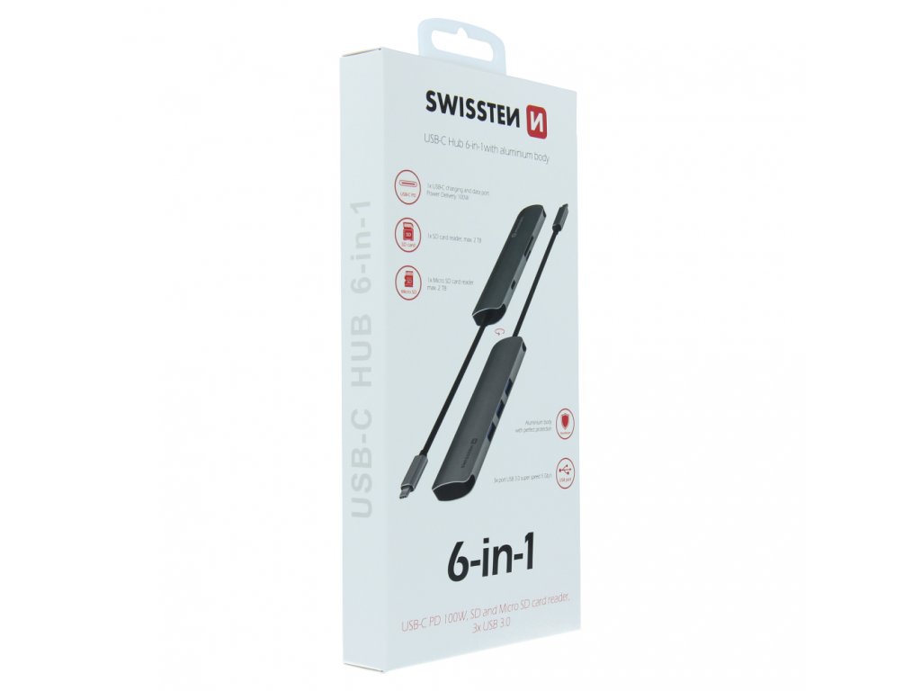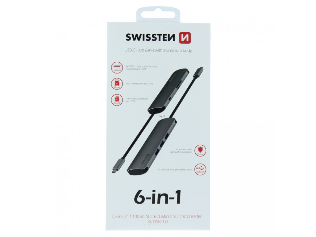 Jak už jsem zmínil v odstavci výše, tak se v rámci této recenze společně podíváme na USB-C hub Swissten 6v1. Konkrétně tento hub nabízí 3x konektor USB 3.0, jeden USB-C PowerDelivery konektor s výstupním výkonem až 100 W, a poté čtečku SD a microSD karet. Swissten má v portfoliu ještě levnější hub, který nabízí pouze 4x USB 3.0, na druhou stranu poté nechybí ani dražší hub s označením 8v1. Ten oproti hubu 6v1 nabízí ještě konektor HDMI a LAN. Co se týče HDMI konektoru, tak ten dokáže přenést až 4K obraz při rozlišení 3840×2160 pixelů a frekvenci 30Hz, zmíněná čtečka karet dokáže poté pracovat až s SD kartami o velikosti 2 TB. Výše jsem ještě zmínil existenci docku – ten je vybaven 2x USB-C, 3x USB 3.0, 1x HDMI, 1x LAN, čtečkou karet microSD a SD, 3,5mm jackem a VGA.