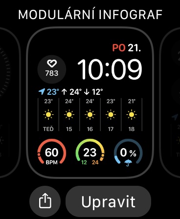 V případě, že jste ve starších verzích watchOS chtěli provést úpravu ciferníku, tak bylo nutné, abyste se na domovské obrazovce na konkrétní ciferník přesunuli, a poté na něj silně zatlačili prstem, čímž jste se ocitnuli v režimu úprav. V příchodem watchOS 7 se však k úpravě ciferníku nově dostanete tak, že na něm jednoduše podržíte prst, bez nutnosti silného stisknutí. Jakmile tak učiníte, tak se vám zobrazí přehled všech vašich ciferníků, společně s tlačítkem Upravit a tlačítkem sdílení. Právě sdílení ciferníků je další novinkou ve watchOS 7.