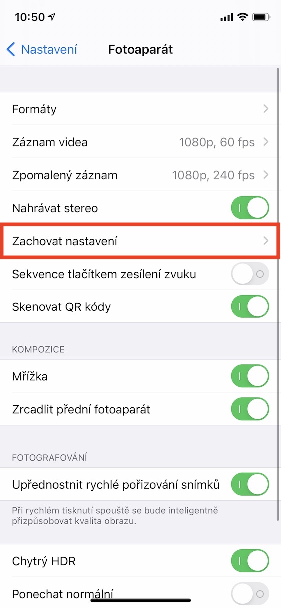 Jak na iPhone nastavit, aby se nastavení Fotoaparátu po jeho opuštění neresetovalo