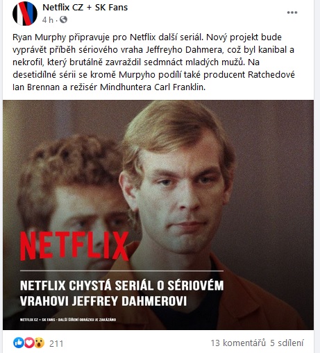 Na Netflix v budoucnu přibude další zajímavá exkluzivita. Facebooková skupina Netflix CZ + SK Fans totiž informovala, že se připravuje seriál o sériovém vrahovi Jeffreym Dahmerovi, jenž byl kanibal a nekrofil, který zabil 17 mladých mužů. Prozatím ovšem není jasné, kdy jej na Netflixu uvidíme.