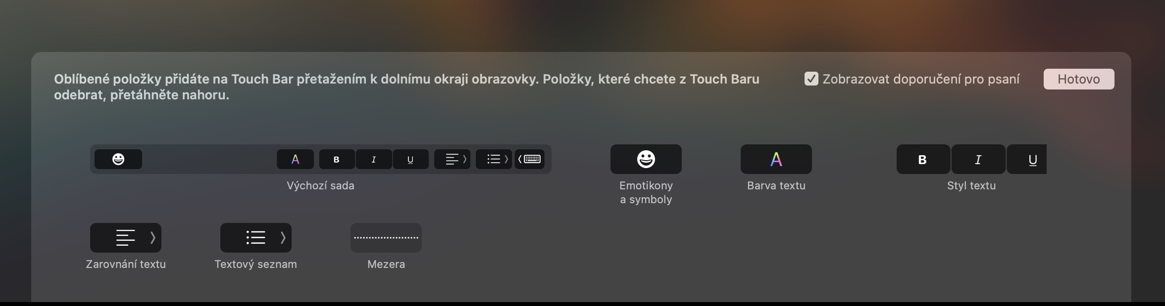 Kromě toho, že si můžete upravit prvky Touch Baru, tak si můžete upravit také zobrazení Control Stripu. Pokud už MacBook s Touch Barem vlastníte delší dobu, tak s největší pravděpodobností více, co to Control Strip je. Pro ty méně znalé se jedná o malou sekci v pravé části Touch Baru, kde se vždy zobrazují tři nebo čtyři tlačítka. Ve výchozím nastavení se jedná a tlačítka pro úpravu jasu a hlasitosti a pro aktivaci Siri. Pomocí šipky si poté můžete Control Strip otevřít a nechat si zobrazit i ostatní ovládací tlačítka. Pokud si chcete tlačítka v Control Stripu přizpůsobit, tak se prvně přesuňte do konkrétní aplikace, a poté v horní liště klepněte na Zobrazení -> Přizpůsobit Touch Bar. Prvky se opět začnou třást a vy pomocí prstu klepněte na Control Strip v Touch Baru, čímž jej označíte. Poté už stačí provádět klasické úpravy, stejně jako při úpravě Touch Baru jako takového.