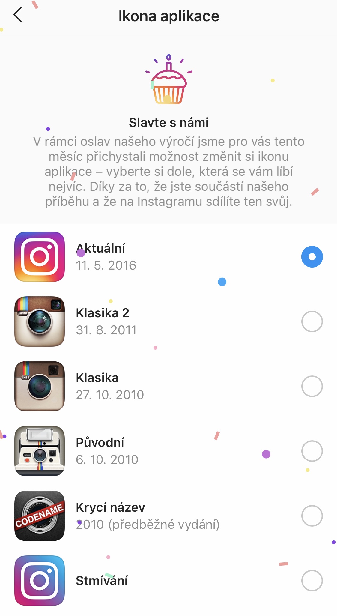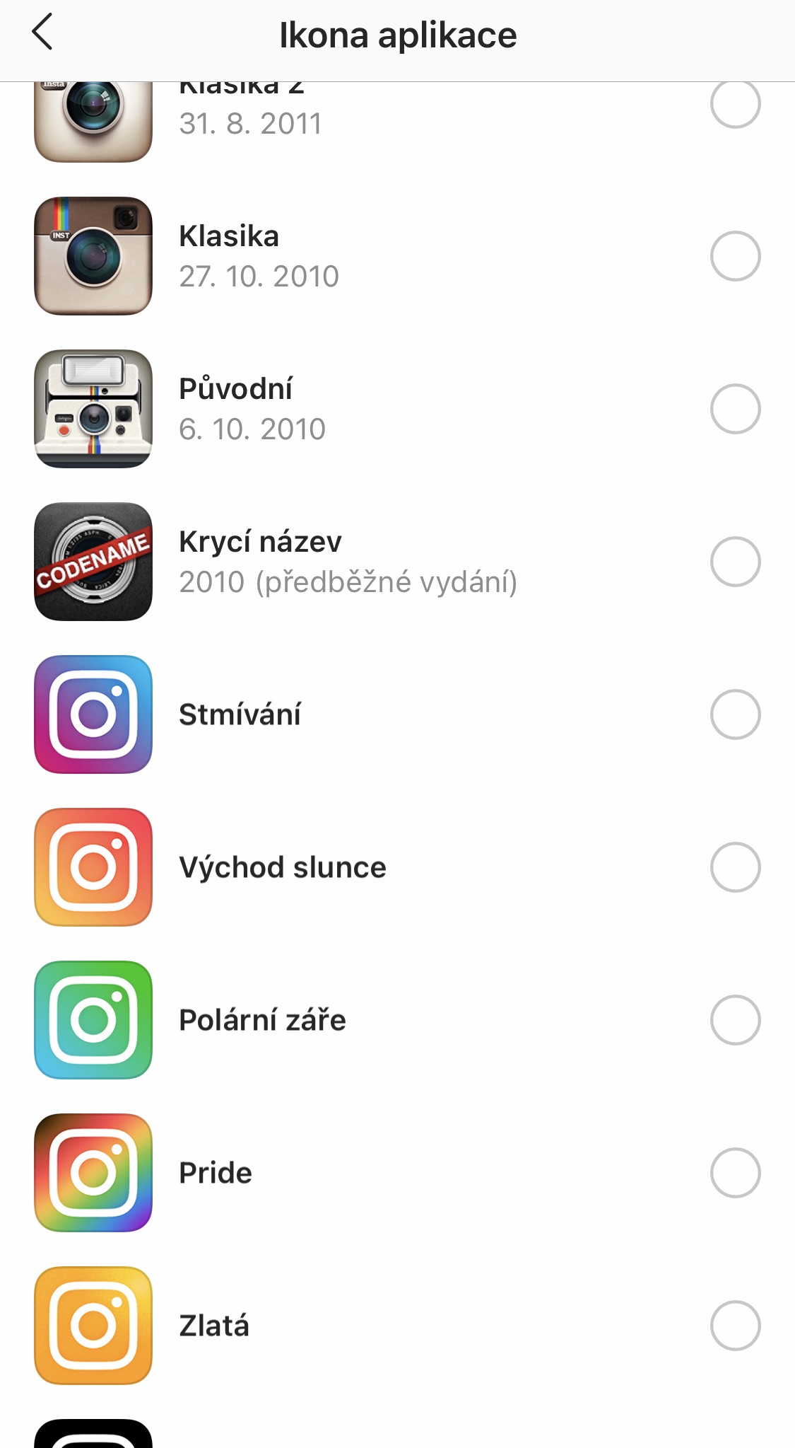 Instagram nově umožňuje změnu ikonky své aplikace – můžete si nastavit například historicky první ikonku Instagramu, nebo některou z jejích barevných variant.