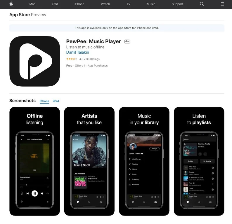 Roman Lukyanov, jenž je šéfem jedné z advokátních kanceláří specializující se na autorské právo, řekl, že žaloba byla podána 1. října tohoto roku, přičemž jako žalovanou stranou byla uvedena společnost Apple. Jedna z aplikací zvaná PewPee: Music Player nabízí uživatelům podobné funkce jako Spotify. Uživatel se v tomto případě bezplatně zaregistruje a má přístup k obsáhlému katalogu hudby, přičemž je umožněno tyto skladby i stahovat a poslouchat je offline. Není však jasné, odkud aplikace hudbu získává. Aplikace má i webové rozhraní, v tomto případě lze vidět URL, odkud se MP3 soubory stahují. Žalobci mají tedy za to, že na obdobném principu funguje i mobilní aplikace. Další aplikace je iMus, která umožňuje streamovat hudební stopy stažené z YouTube, které jsou ovšem proložené reklamami. Třetí aplikace Music Downloader & Player nabízí totéž, co iMus, ovšem s možností stahovat a poslouchat offline. Uživatelé zde mohou také platit předplatné, aby se vyvarovali reklamám.