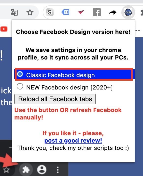 - Pokud se chcete vrátit zpět na nový design, tak klepněte na ikonu doplňku, zvolte možnost NEW Facebook design [2020+] a aktualizujte stránku.