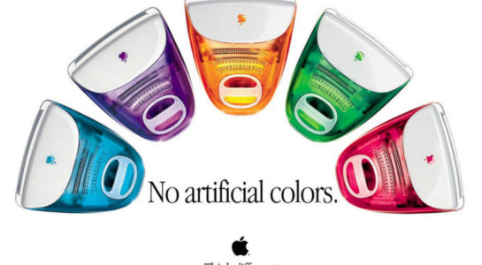 S příchodem iMacu G3 v roce 1998 začaly reklamy společnosti Apple postupně získávat více “umělecký” nádech. Jejich cílem bylo zpočátku především upozornit na to, že jablečný hardware prochází zásadní proměnou. Apple chtěl ve svých reklamách představit své počítače jako stylový, unikátní, zábavný i užitečný doplněk, který každý zatouží mít doma. Dříve obsáhlý, informativní text se zredukoval na úderné a působivé slogany, do popředí se dostala estetická stránka produktů. Dalo by se říci, že se tiskové reklamy Applu měnily spolu s tím, jak se měnily jablečné produkty. Obsáhlejší vysvětlování, proč zrovna vy potřebujete zrovna tento produkt, postupně opadlo. Namísto toho začal Apple na svých plakátech i v reklamách v časopisech sázet na stylizované, dokonale upravené fotografie svých produktů, doprovázené jednoduchými, ale údernými slogany – a mnohdy nešlo ani o celé věty. Spotřebitelé se mohli setkat s větami typu “Take a Bite” nebo “Say Hello to iPod”, ale také se slogany “Bigger than biger”, “Sorry. No beige”, nebo zkrátka jen “Yum”. Nutno podotknout, že tato strategie fungovala skvěle.
