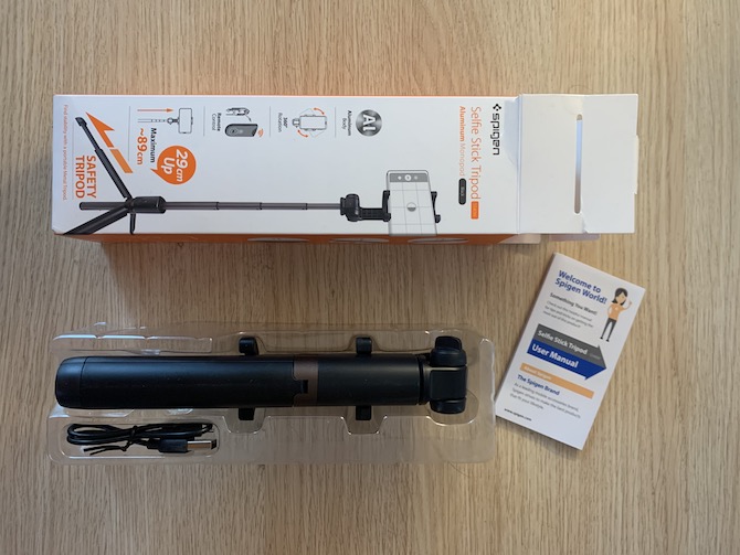 Spigen Selfie Stick Tripod je zabalen v kompaktní krabičce s přehledným nákresem všeho, co tato užitečná pomůcka zvládá. Uvnitř krabičky se nachází plastová “vanička” s tripodem a příslušenstvím, součástí balení je také uživatelský manuál v několika jazycích. Balení je úsporné, kompaktní, ale odolné a bezpečné, a určitě se nemusíte obávat toho, že by v něm staviv utrpěl jakoukoliv újmu. Kromě stativu a návodu naleznete v balení také micro-USB kabel.