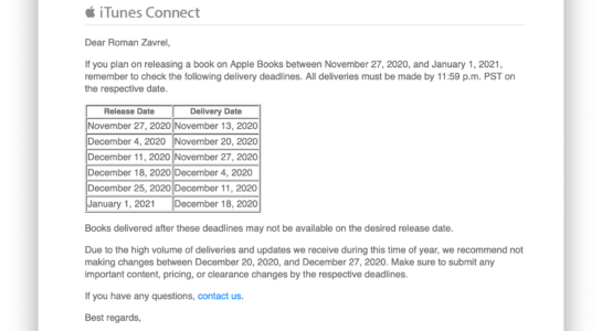 Zatím co my se připravujeme na příchod iPhone 12 Pro a iPhone 12 do redakce, Apple se již připravuje na letošní Vánoce. V mailu, který rozeslal v pátek večer všem, kteří využívají Apple Books informoval o tom, kdy je nutné nejpozději dodat své knihy ke schválení, aby byly publikovány ještě před letošními svátky. Pokud chcete aby vaši knihu Apple zveřejnil ještě před 24. 12. 2020, pak ji musíte odeslat ke schválení nejpozději 11. 12. 2020, tedy zhruba dva týdny před pubikací. Knihy, jenž mají vyjít 1. 1. 2021 pak vyžaduje Apple ke schválení nejpozději 18. 12. 2020.